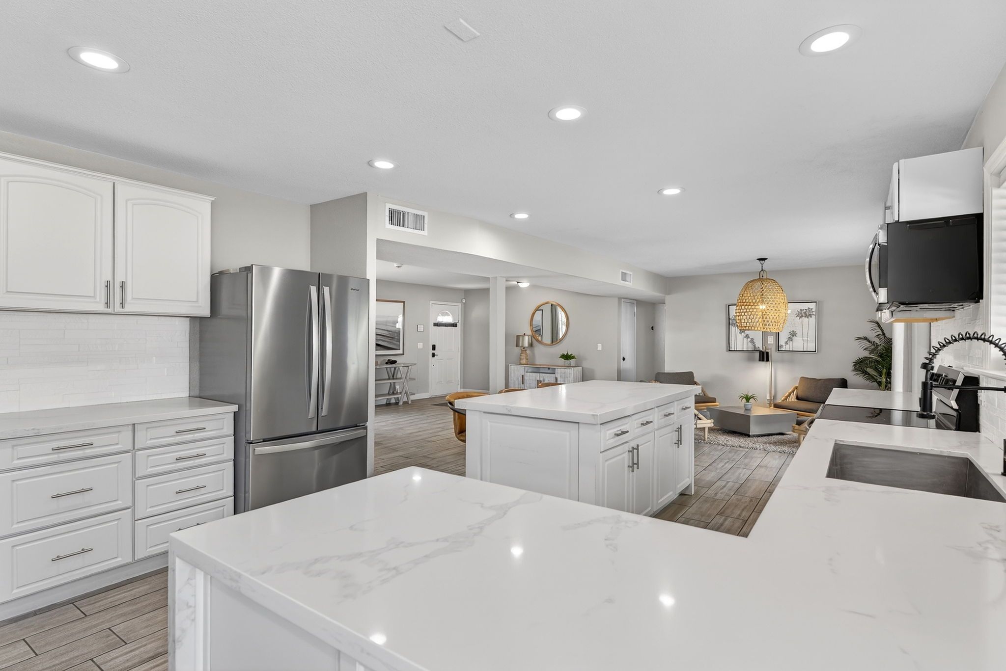 The kitchen serves as the heart of the home, featuring elegant countertops, stainless steel appliances, a reverse osmosis system, and generous prep space designed to support everything from quick weekday meals to large gatherings. Its open connection to the main living areas ensures the cook is always part of the conversation, while the thoughtful upgrades provide both beauty and practicality. This is a space designed not just for cooking, but for living.