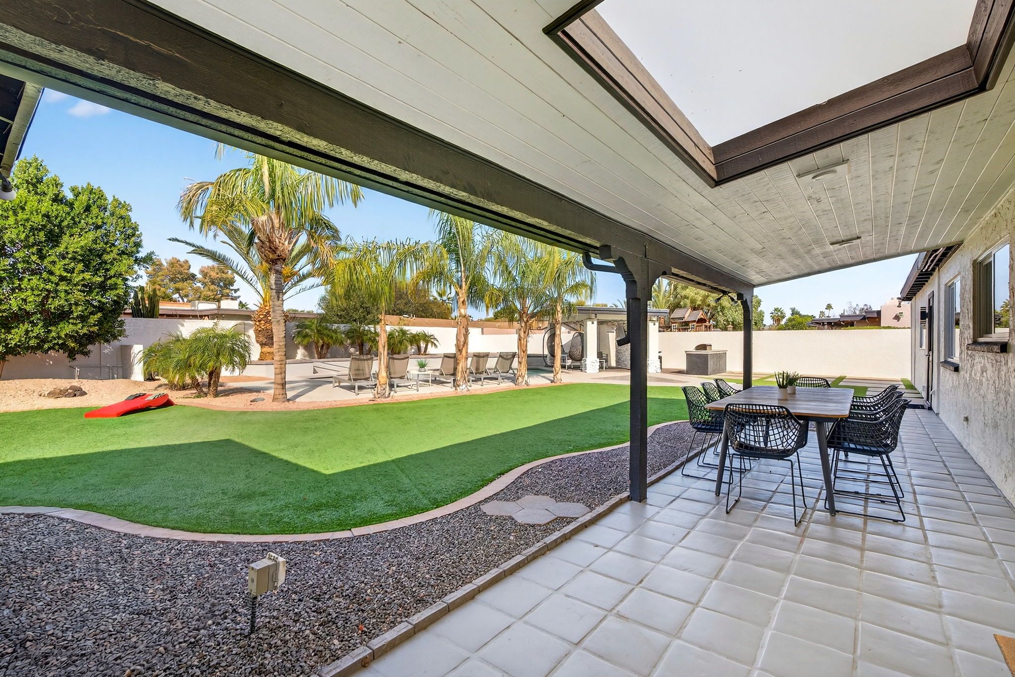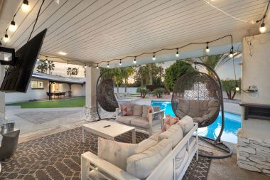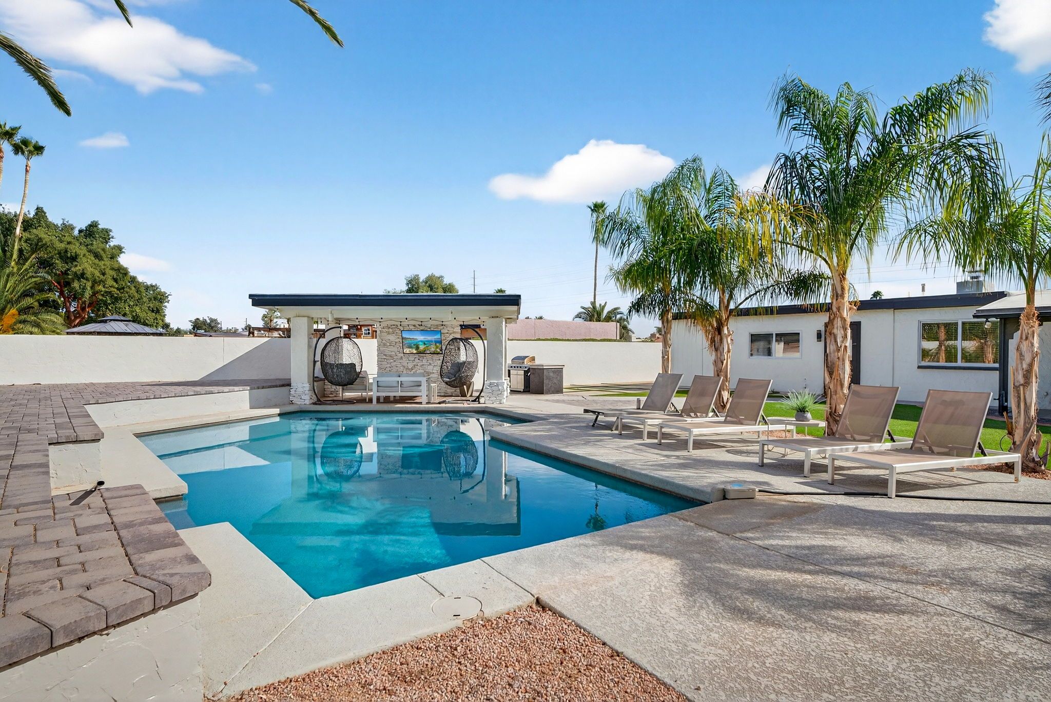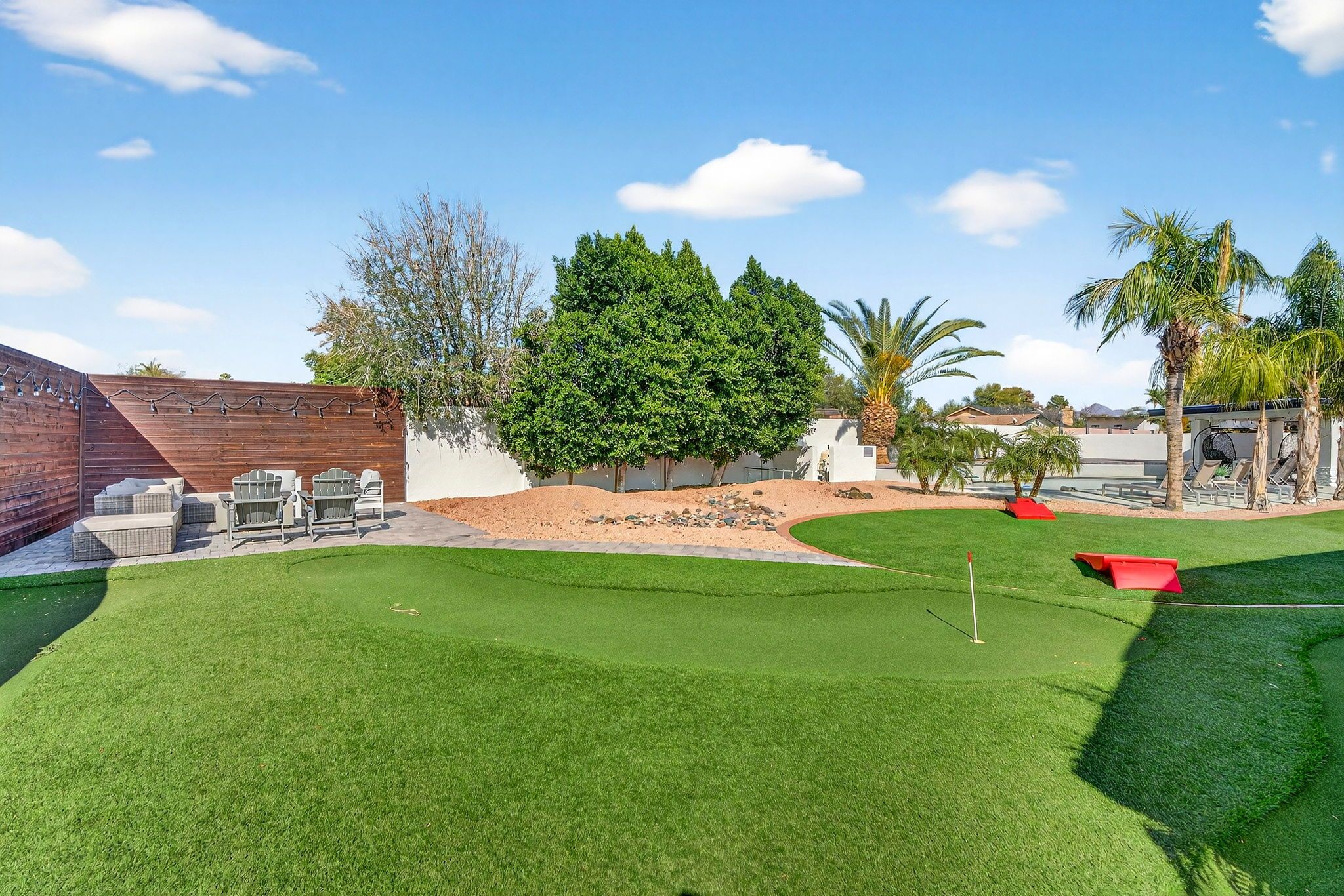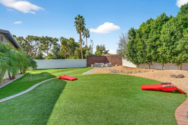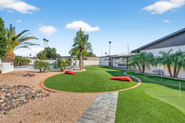 Step outside to a private backyard designed for both relaxation and entertaining. The heated pool anchors the space, complemented by a gazebo, built-in BBQ, dedicated fire pit area, and even a private putting green — creating a true resort-style experience at home. Whether hosting lively gatherings or enjoying peaceful evenings under the Arizona sky, this outdoor environment delivers year-round enjoyment. Recent improvements, including refreshed surfaces and exterior updates, enhance both appearance and long-term durability.