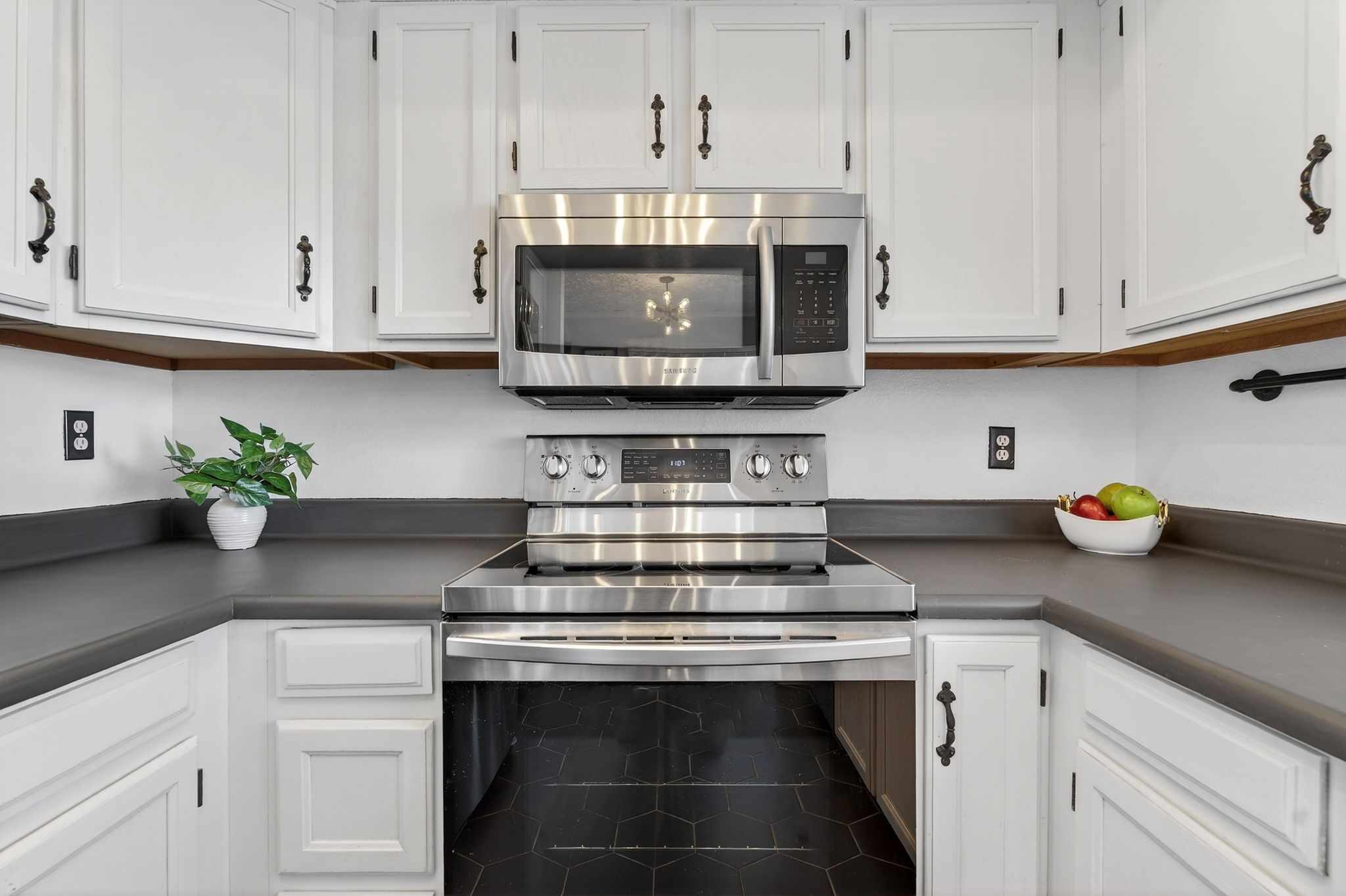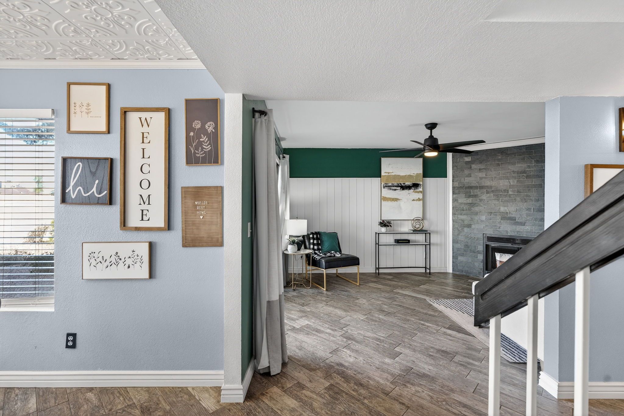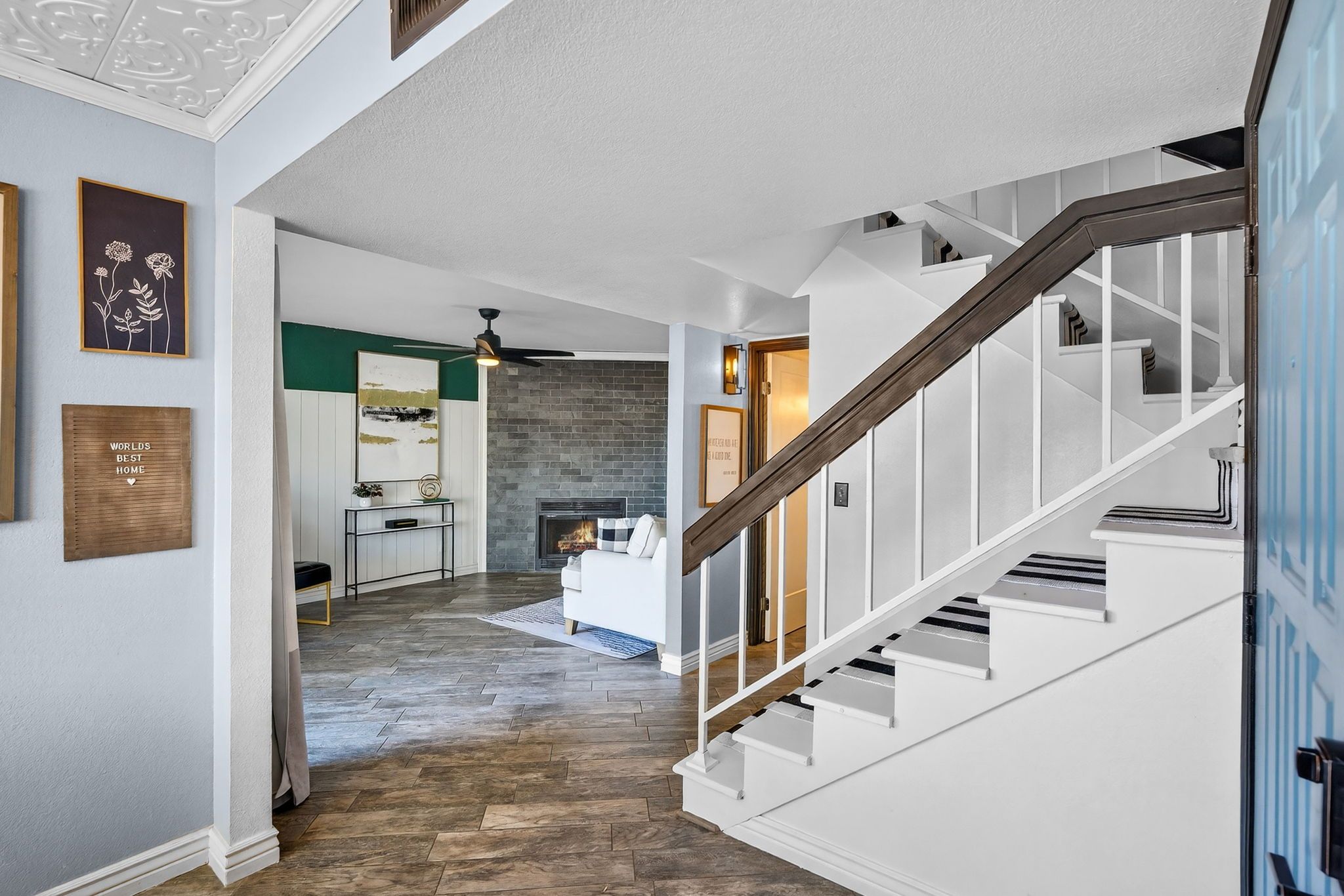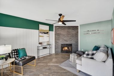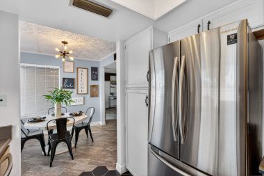 New tile flooring, painted cabinetry, and updated lighting and fixtures give the space a clean, cohesive look that feels current without being trendy. Large picture windows fill the home with natural light, and a cozy fireplace anchors the main living area, creating a space that feels both comfortable and elevated.