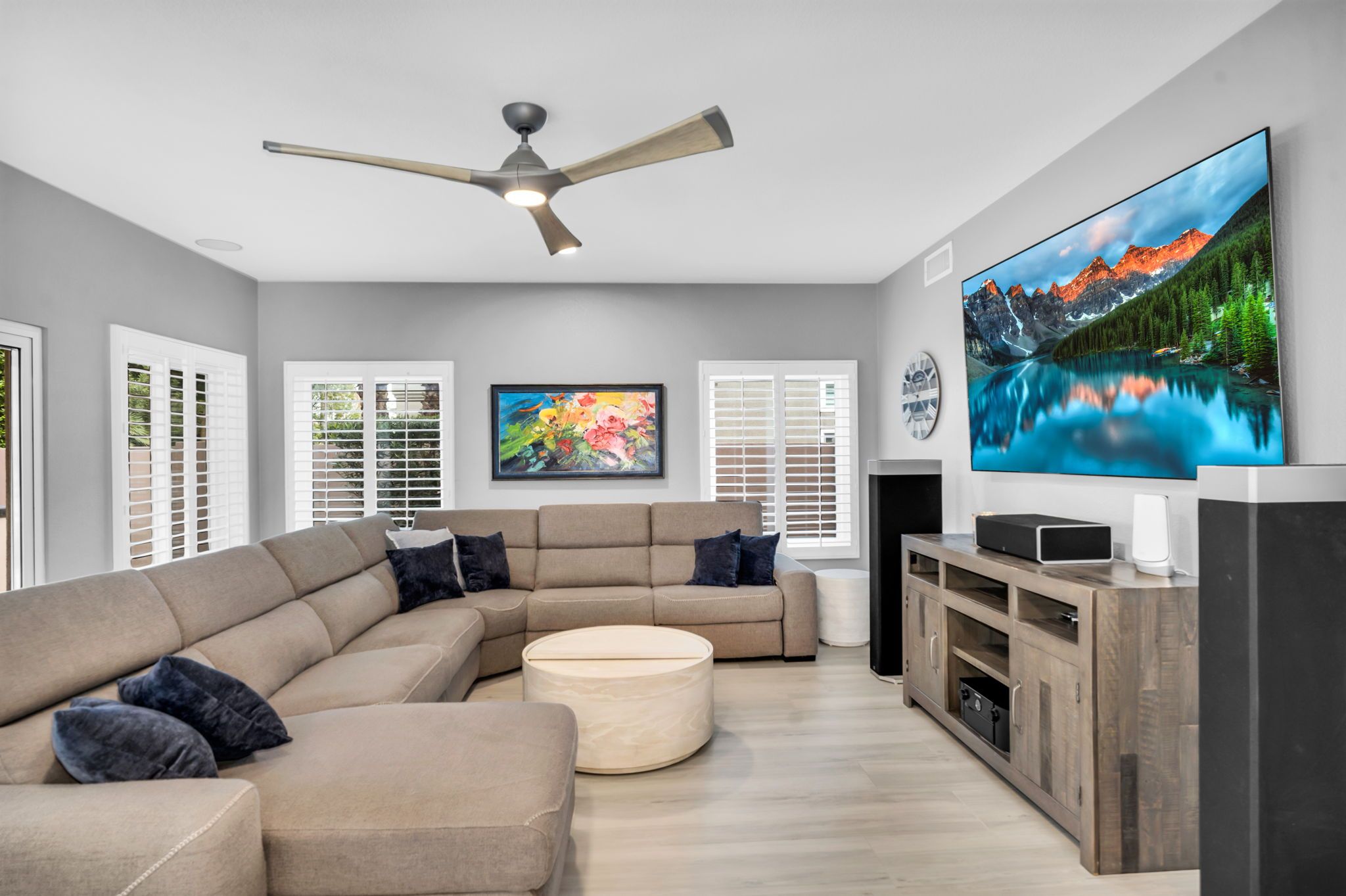 Designed to impress, the custom kitchen is a true showstopper, boasting brand-new Thomasville cabinetry, gleaming quartz countertops, and sleek wood-look porcelain tile flooring that extends throughout the home. Every detail has been considered—from the high-end Samsung smart appliances to the stylish light fixtures and refined hardware—making this kitchen as functional as it is beautiful. A generous island serves as the perfect centerpiece for meal prep and casual dining, while the seamless connection to the expansive family room ensures that the heart of the home is always filled with laughter, conversation, and warmth. With an effortless flow to the backyard, entertaining is as easy as stepping through the doors to paradise.