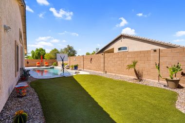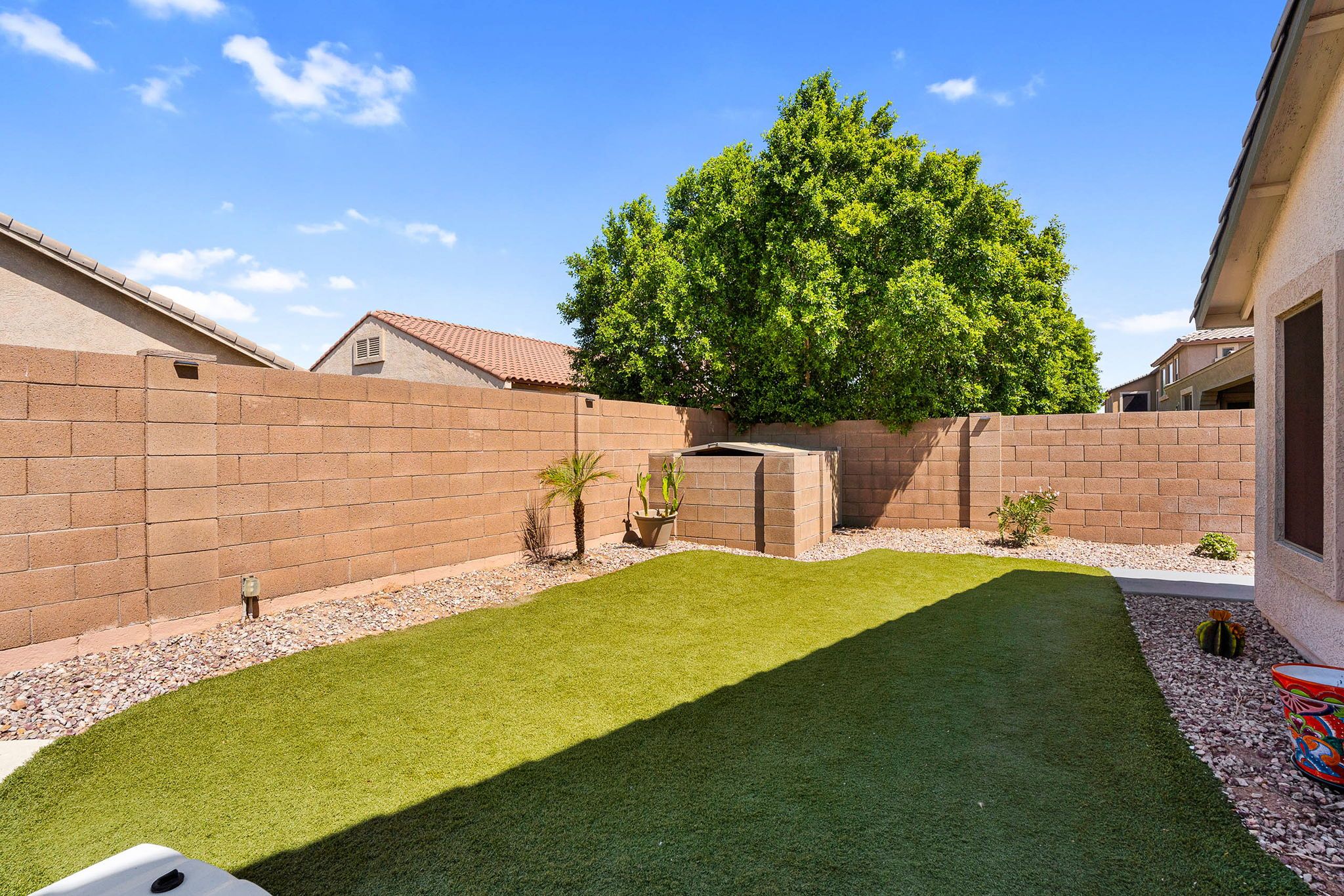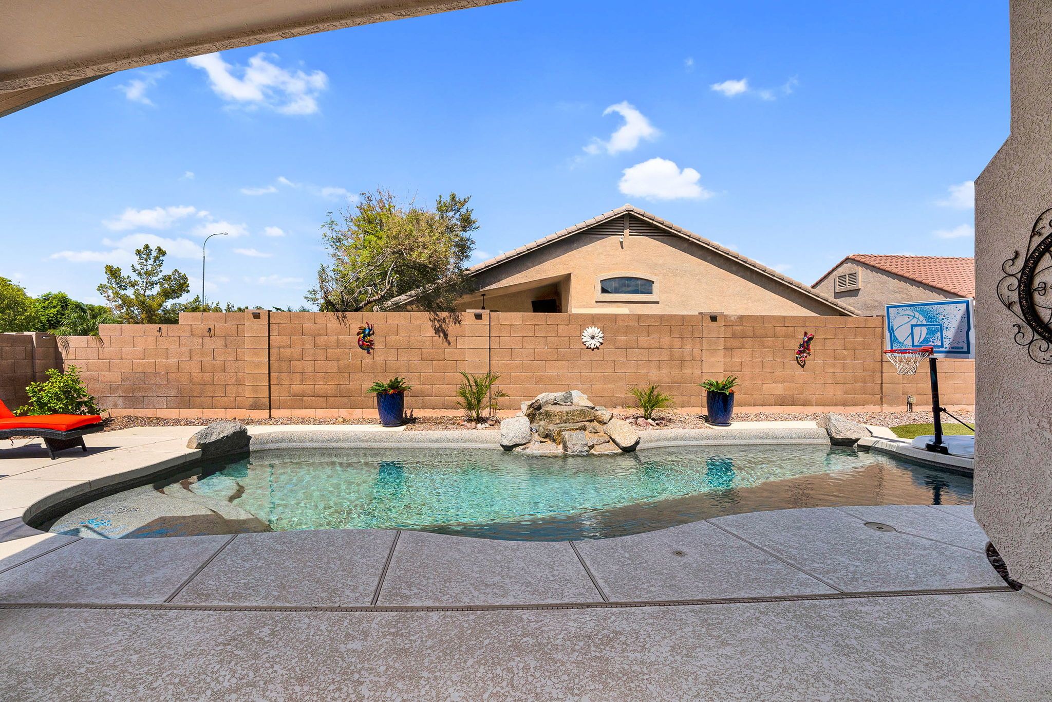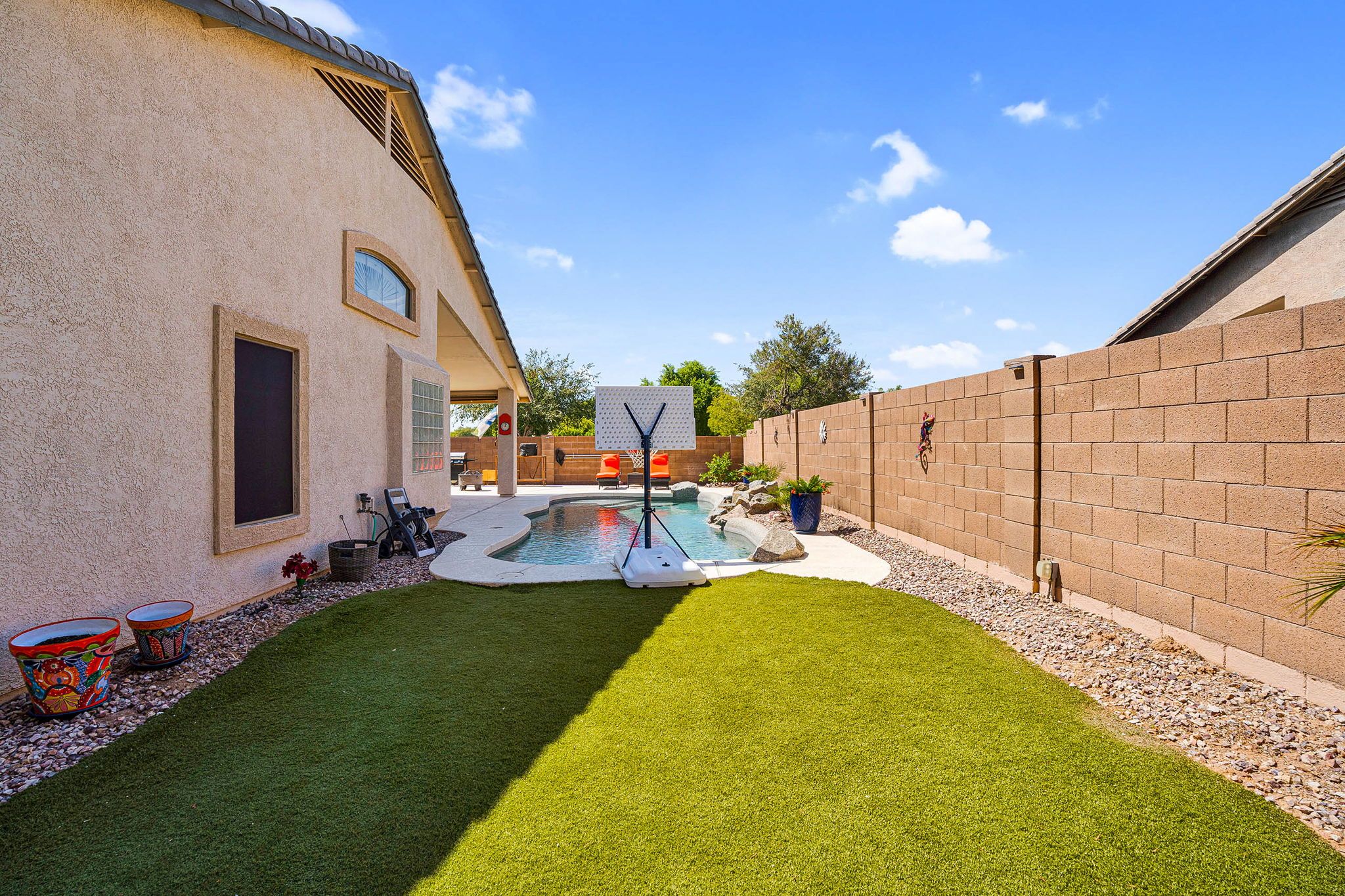 Step outside to your private getaway - a Pebble Tec pool with lounge pad and water feature, surrounded by artificial turf that stays green all year long. A beautiful view of the tops of the trees from the adjacent park from your extended covered patio, with plenty of room in your side yard for gardening create a serene escape from the busy world around you. This prime corner lot is both private and spacious and with no two stories behind you, is even harder to find!