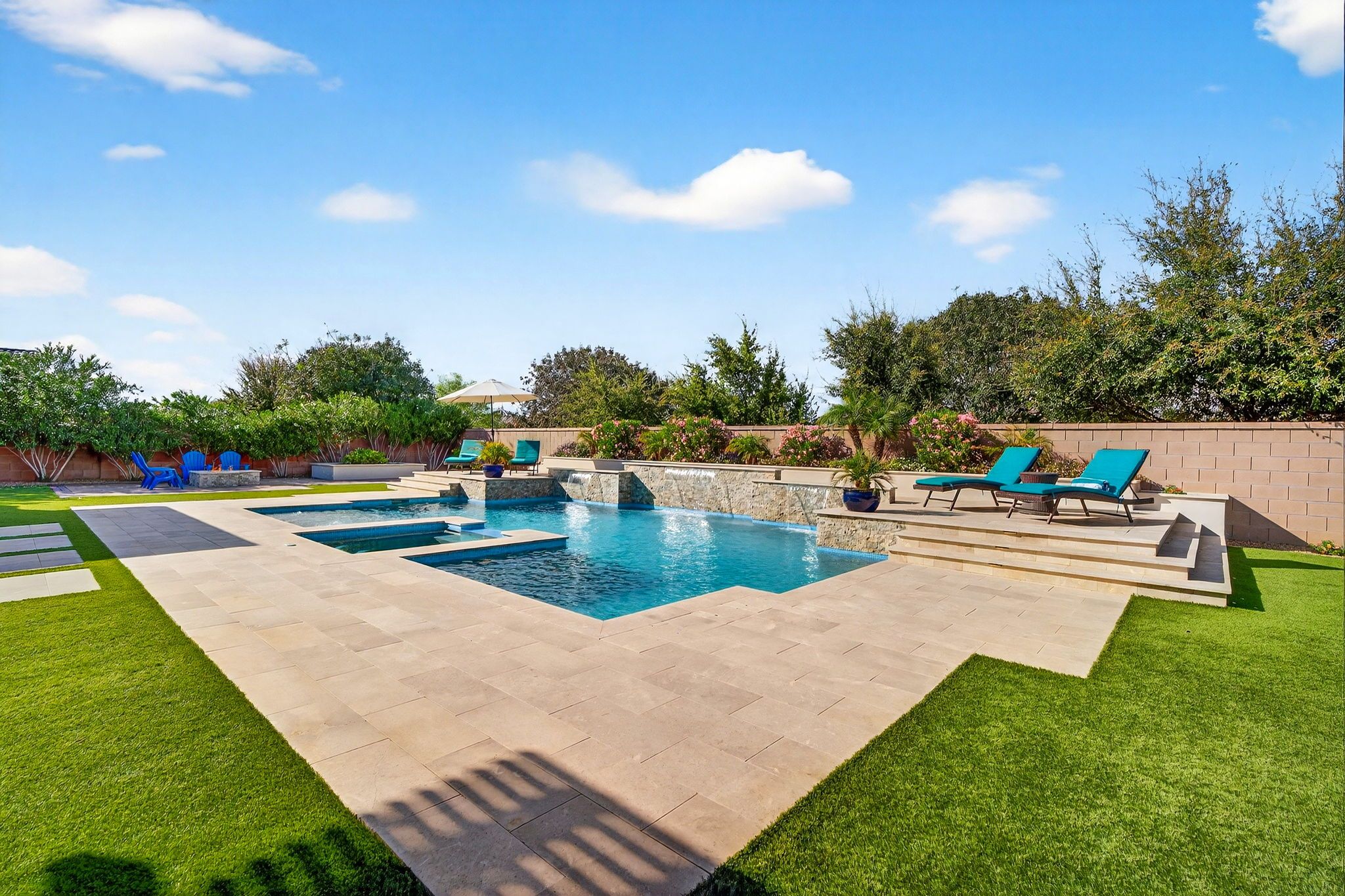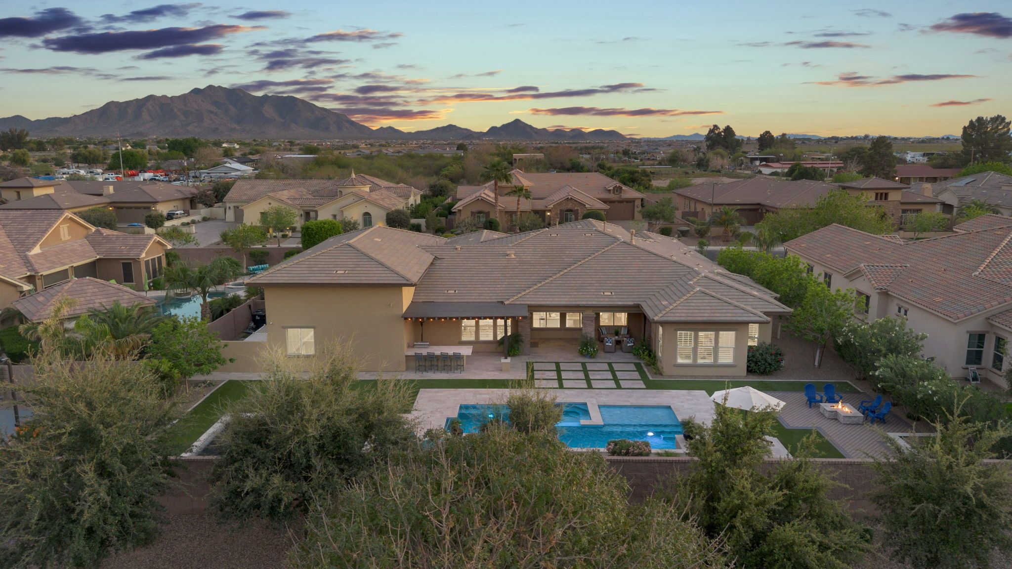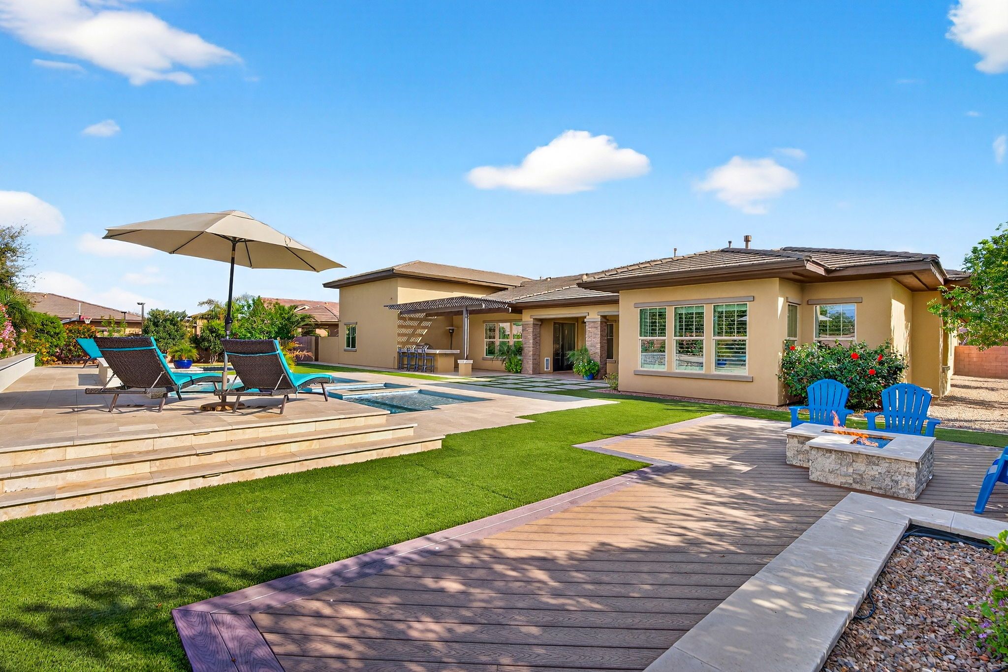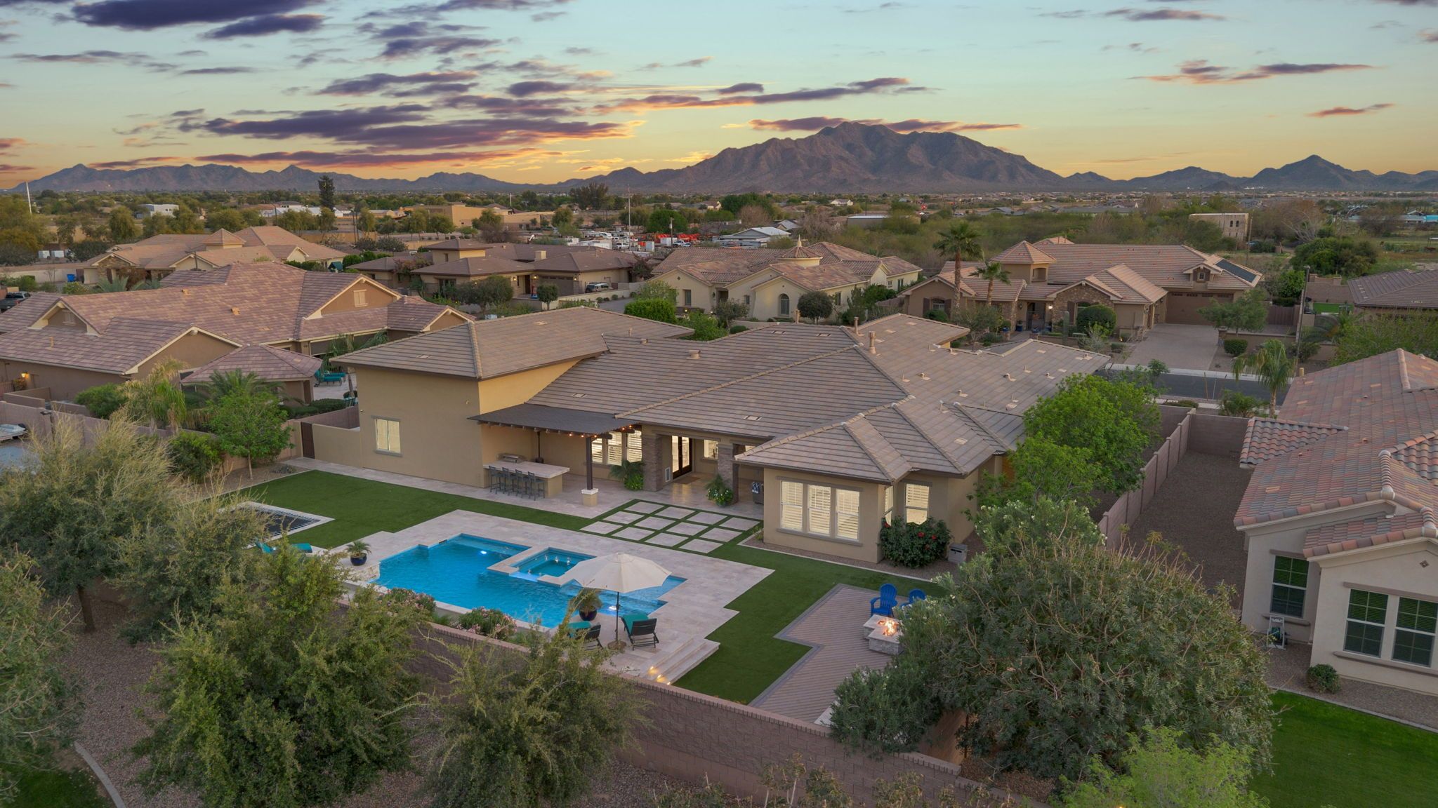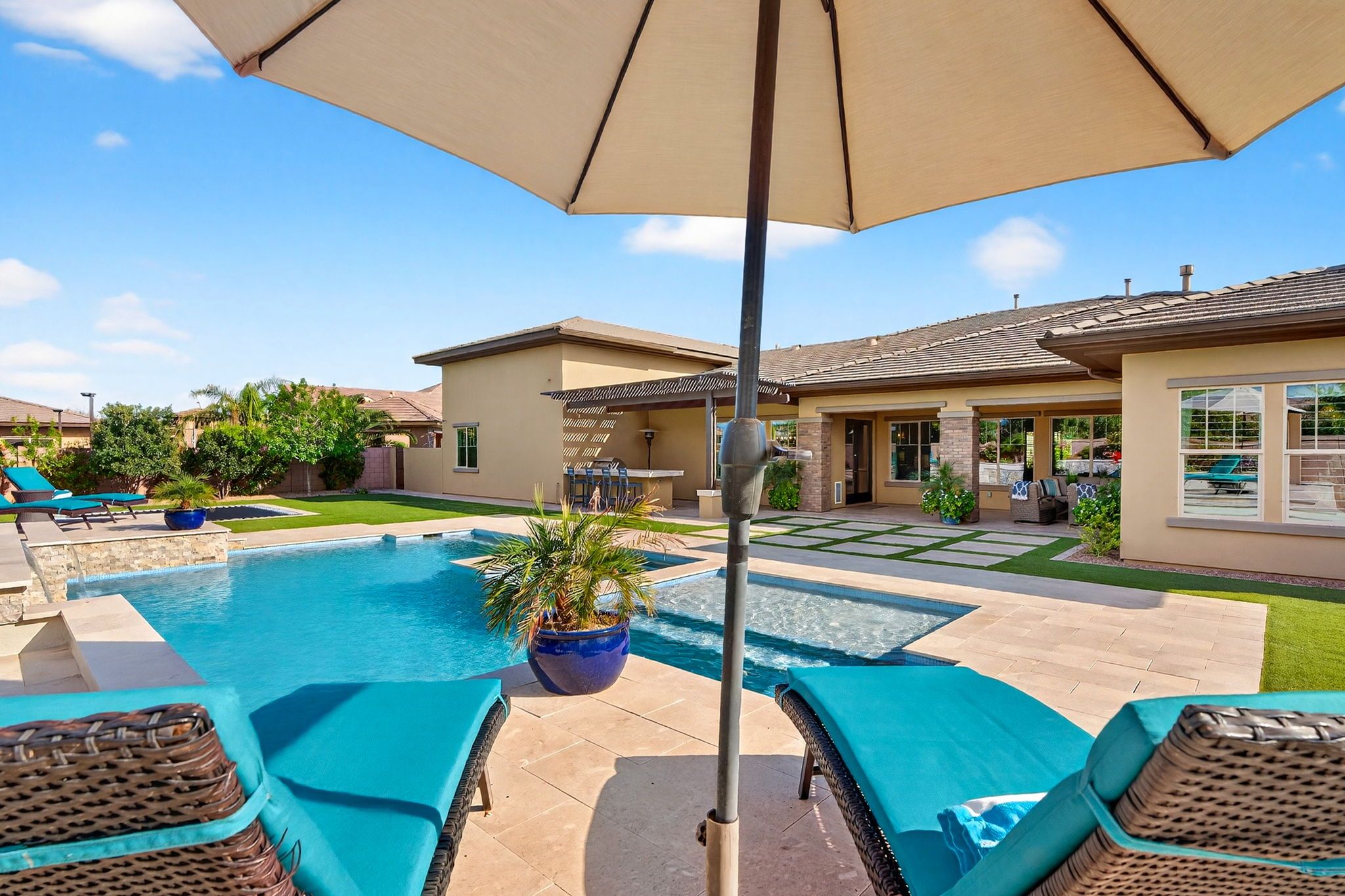 Step outside to discover a backyard designed for both relaxation and entertainment. The saltwater pool features heating and cooling capability, a waterfall feature, glow-in-the-dark tile, and a large Baja step, perfect for enjoying Arizona’s sunny days. An attached spa, gas fire pit, built-in BBQ with rotisserie, and in-ground trampoline create a true backyard retreat with space for gatherings, play, and quiet evenings under the stars. Additionally you'll find plenty of parking space for guests and family members with the corner lot feel of this home, the temperature controlled 2 car garage, the attached RV garage for boats, RVs or an additional 4+ cars - all on the privacy of a neighborhood amenity backing home with no neighbors to the rear.