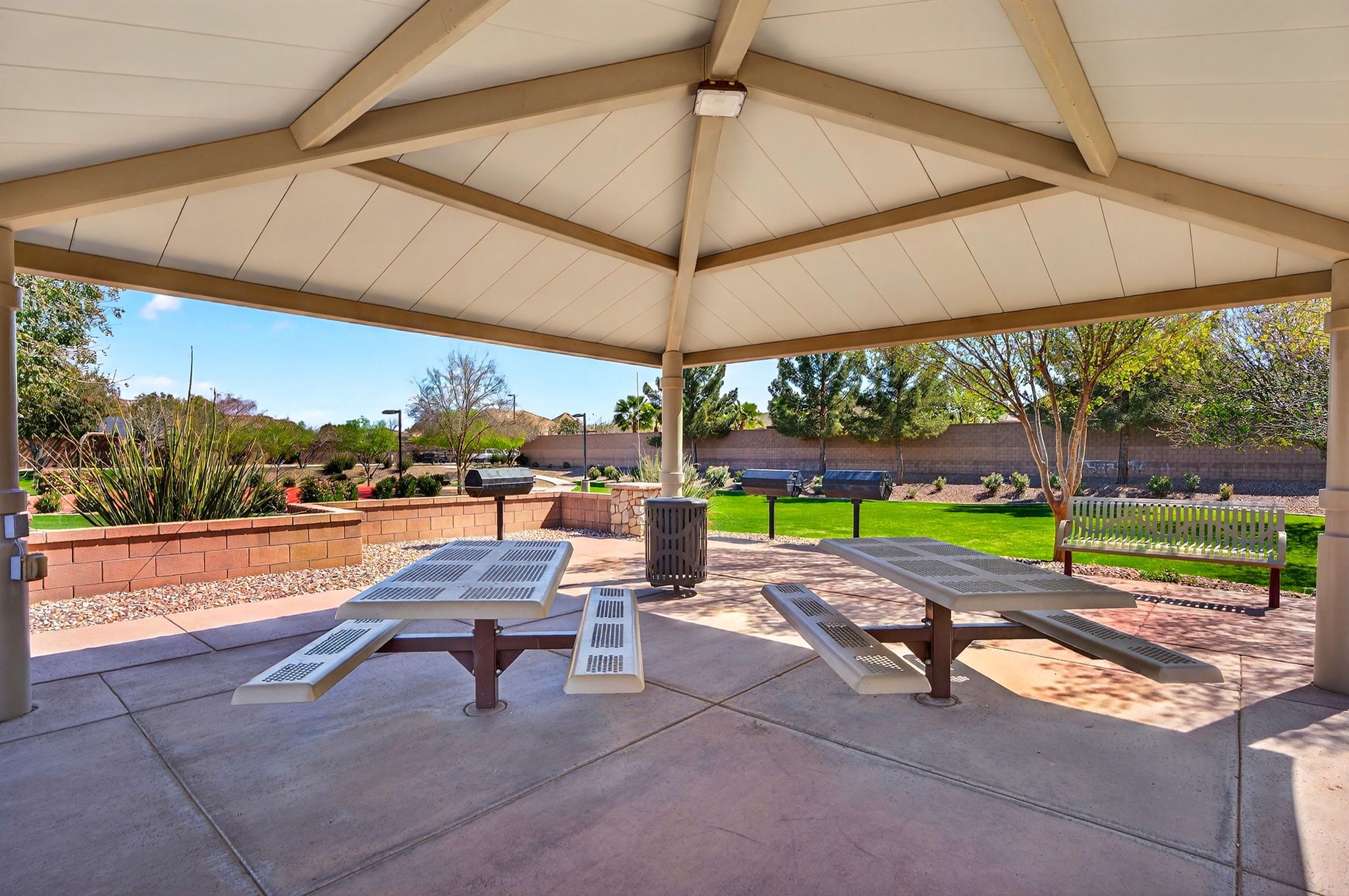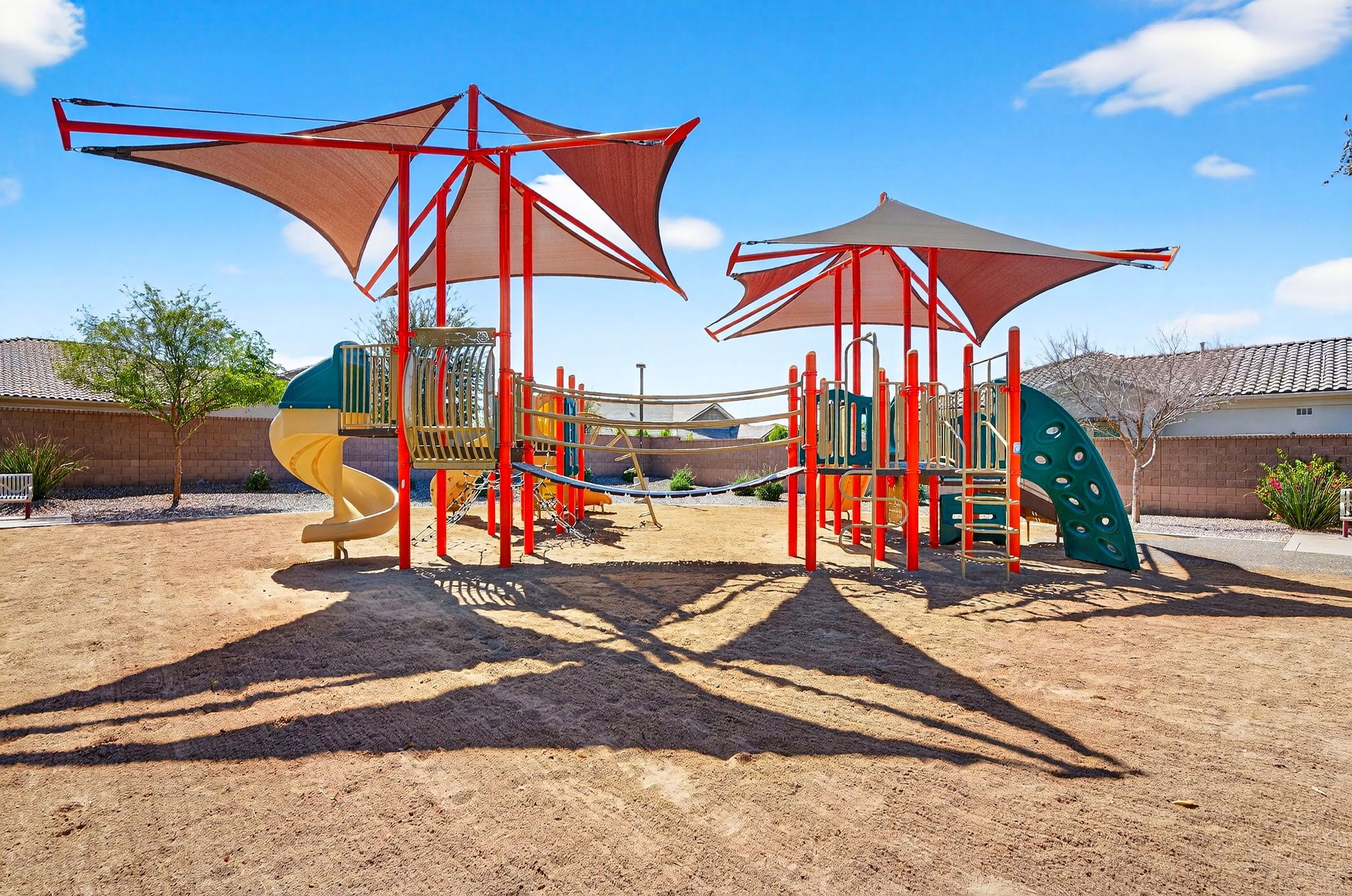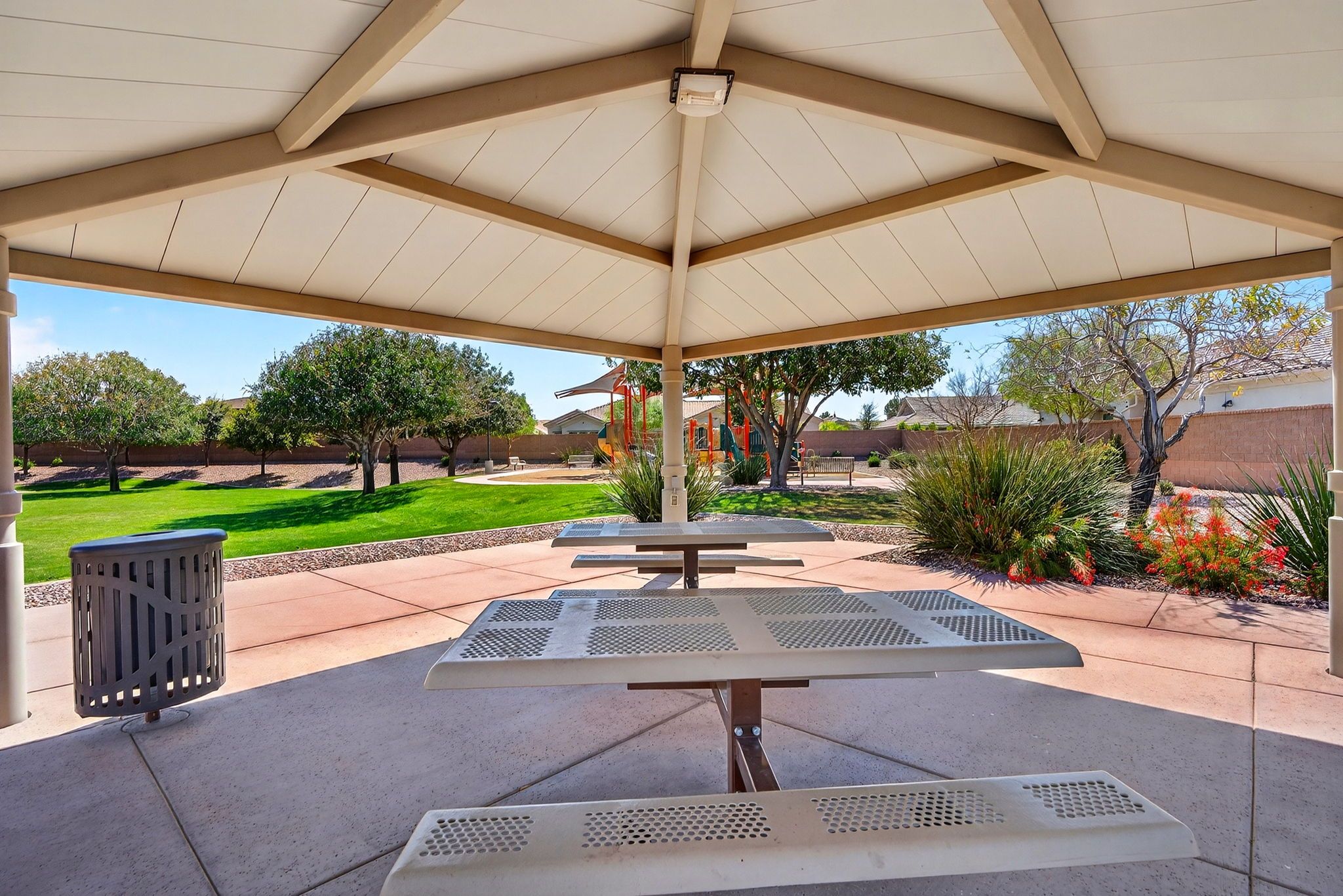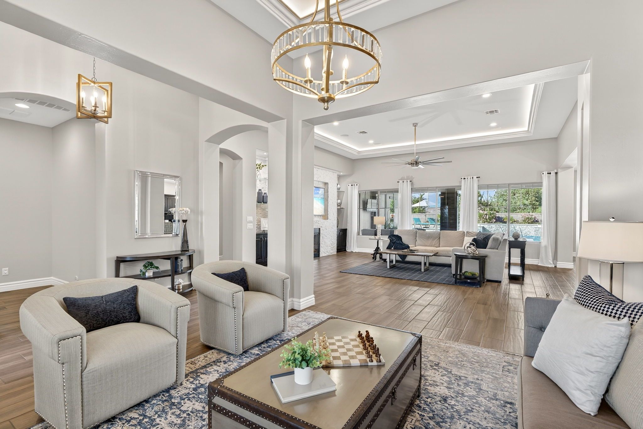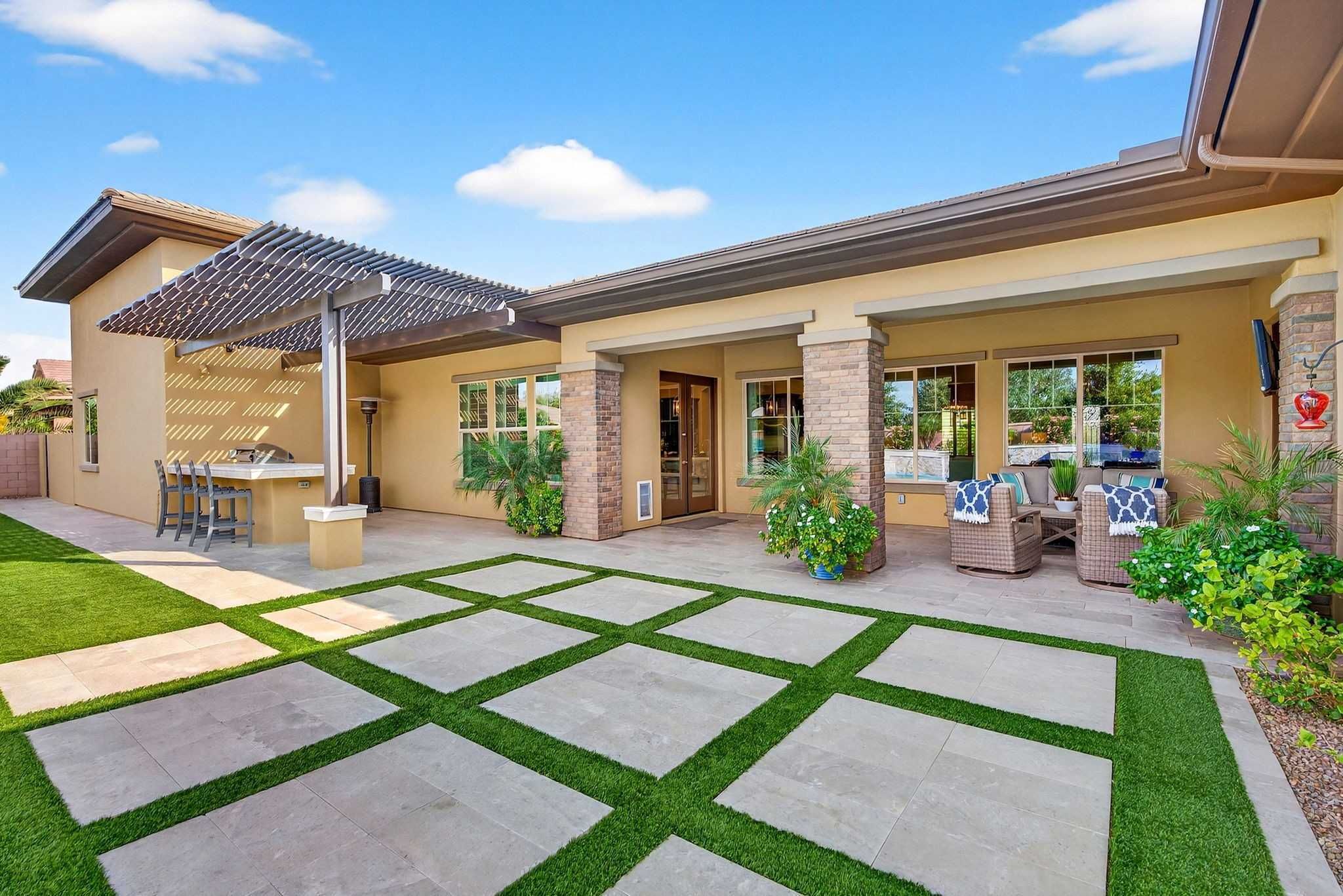 Step outside to discover a backyard designed for both relaxation and entertainment. The saltwater pool features heating and cooling capability, a waterfall feature, glow-in-the-dark tile, and a large Baja step, perfect for enjoying Arizona’s sunny days. An attached spa, gas fire pit, built-in BBQ with rotisserie, and in-ground trampoline create a true backyard retreat with space for gatherings, play, and quiet evenings under the stars. Additionally you'll find plenty of parking space for guests and family members with the corner lot feel of this home, the temperature controlled 2 car garage, the attached RV garage for boats, RVs or an additional 4+ cars - all on the privacy of a neighborhood amenity backing home with no neighbors to the rear.