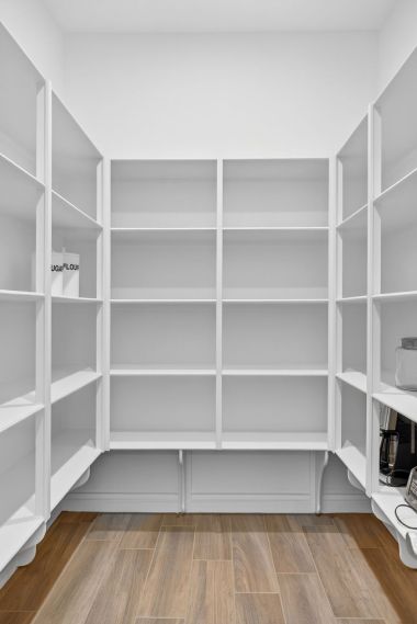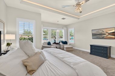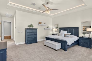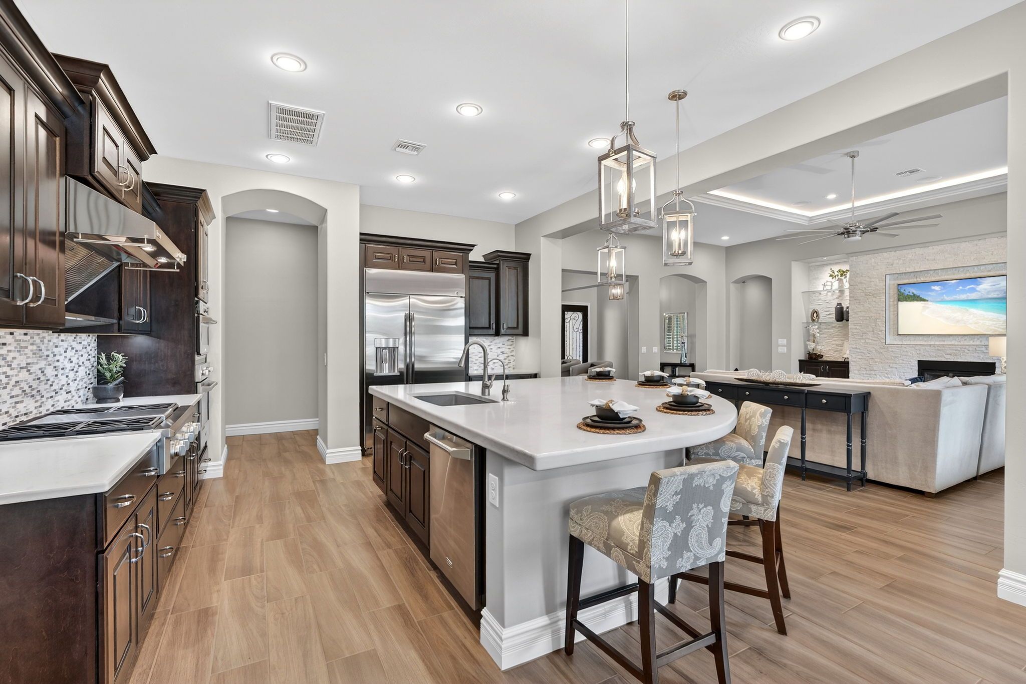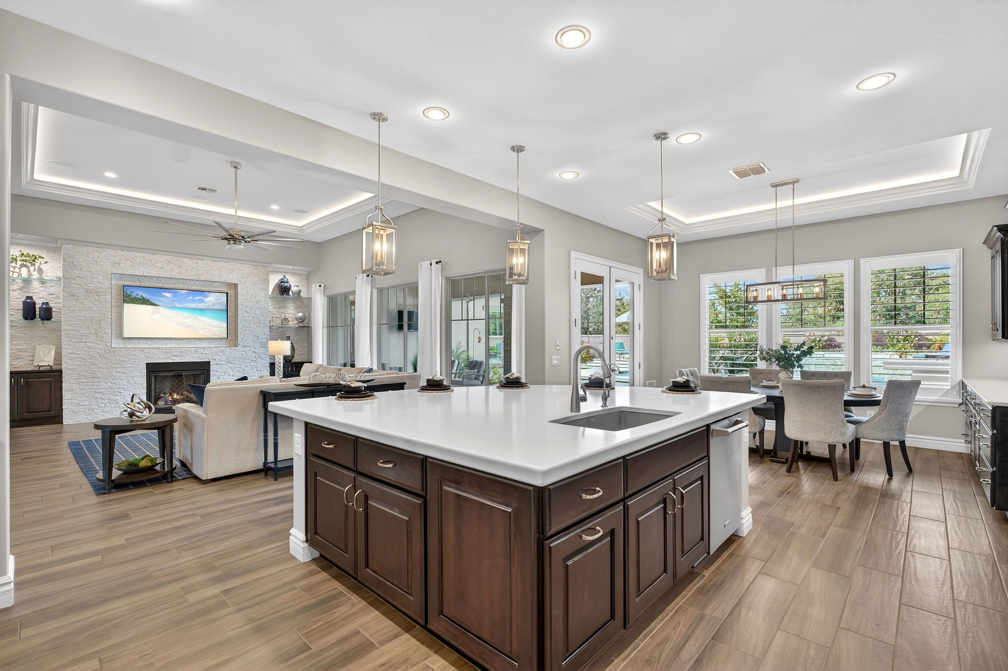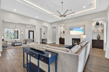 At the center of the home, the expansive great room creates a warm and inviting gathering space. Dropped crown moulding with multi-color LED lighting add a custom architectural touch, while the stacked stone fireplace with glass shelving and recessed lighting anchors the room beautifully. Multi-room surround sound enhances both entertaining and everyday living, creating an atmosphere that feels both comfortable and refined.