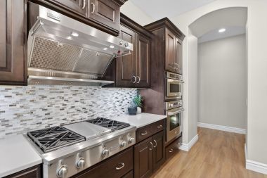 The kitchen was designed with both function and entertaining in mind. Featuring GE Monogram appliances, tile backsplash, and generous workspace, it opens effortlessly to the dining area and great room. Just beyond, a custom bar area with beverage refrigerator, glass shelving, tile accents, and designer lighting creates the perfect setting for hosting friends and family or enjoying relaxed evenings at home.