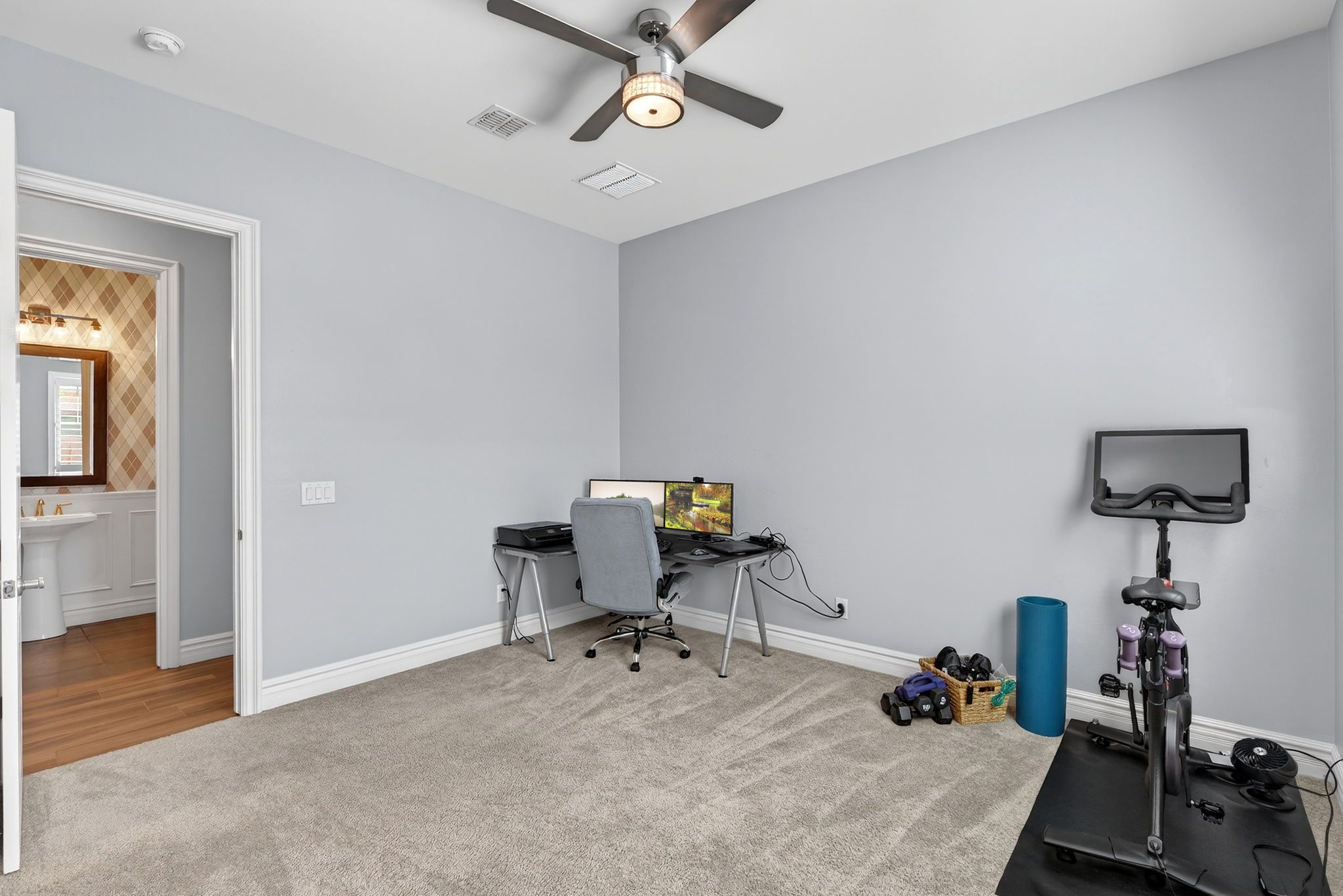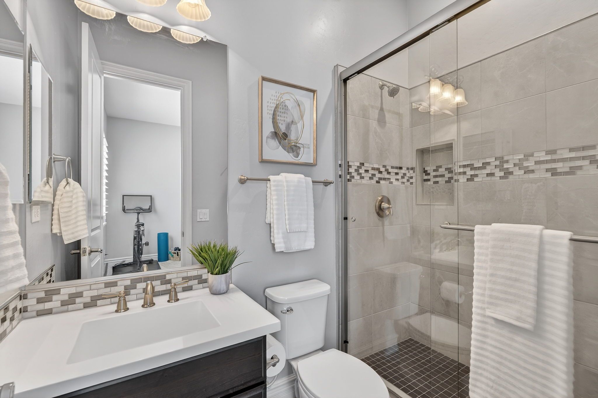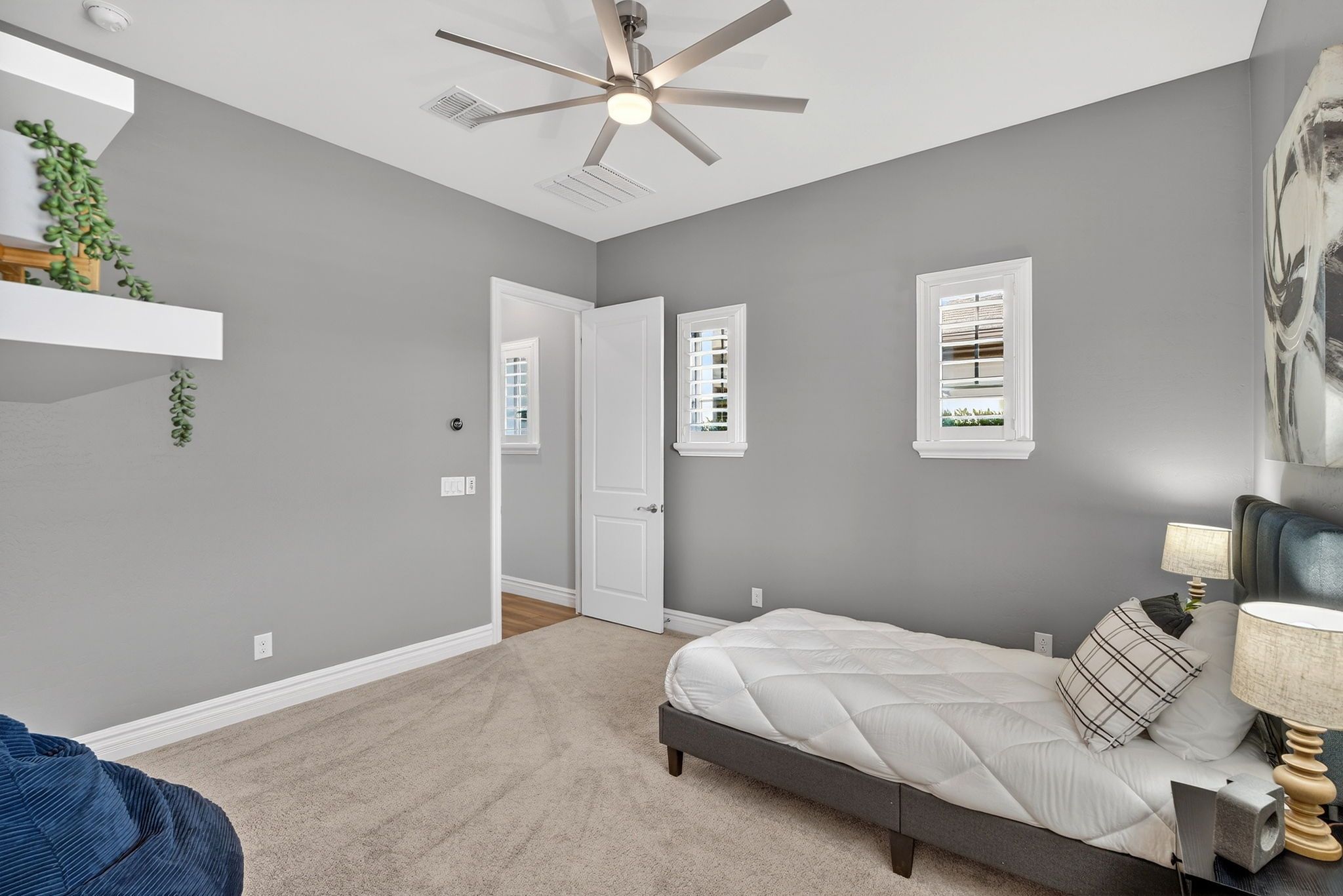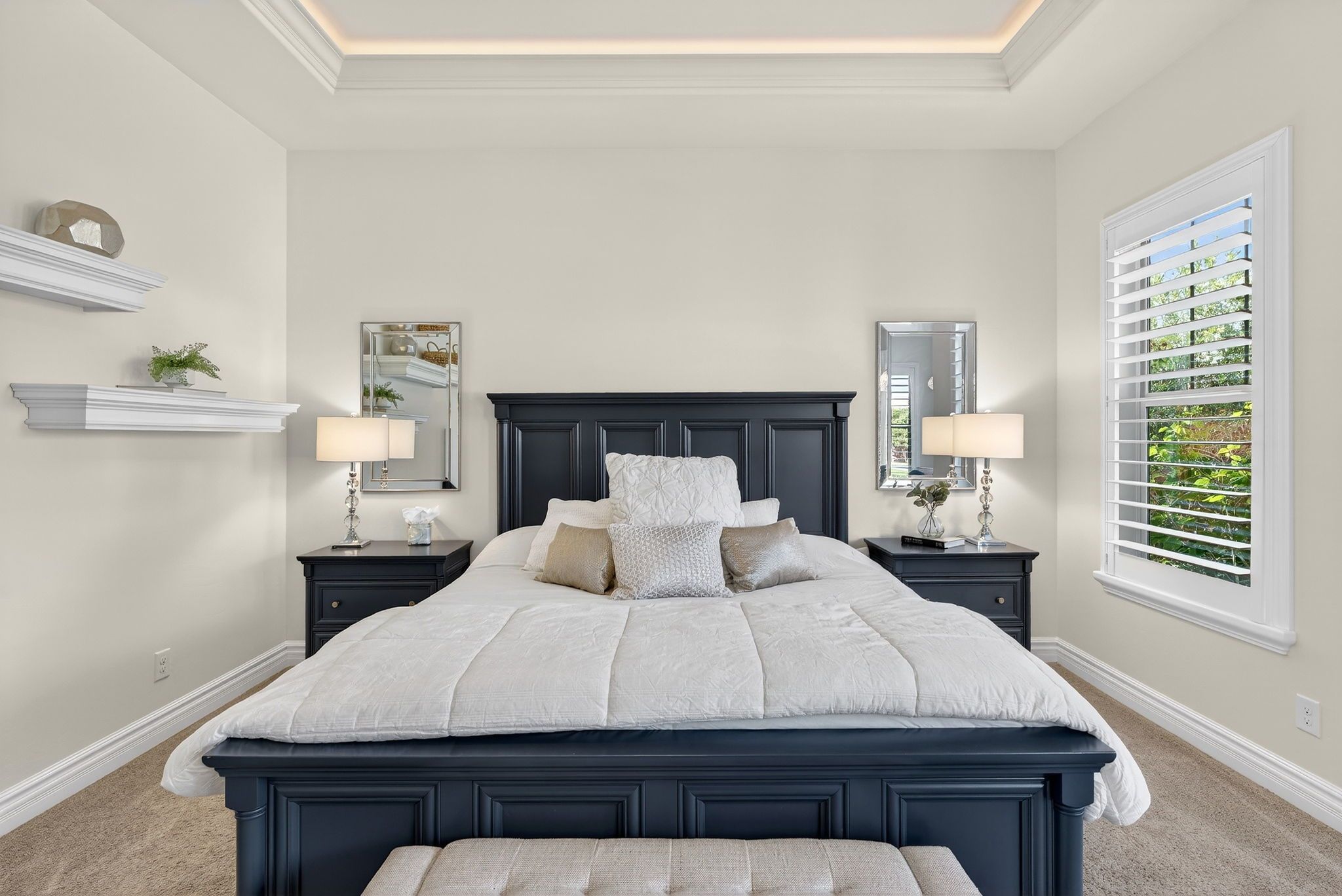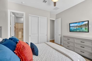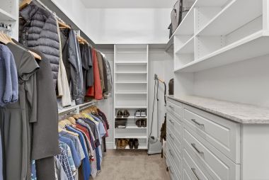 The thoughtfully designed layout includes five spacious bedrooms, each with its own private ensuite bathroom, offering comfort and privacy for everyone in the household. A versatile media or flex room can easily serve as a guest suite, creating ideal accommodations for visitors or multi-generational living. The primary suite provides a peaceful retreat with electric blackout roller shades, a custom California Closet with quartz-topped dresser, and a spa-style bathroom featuring three shower heads.