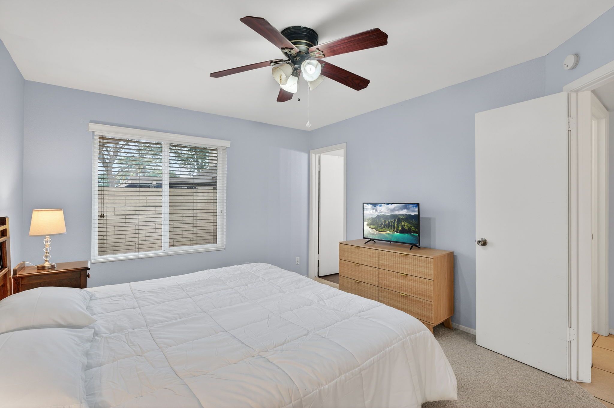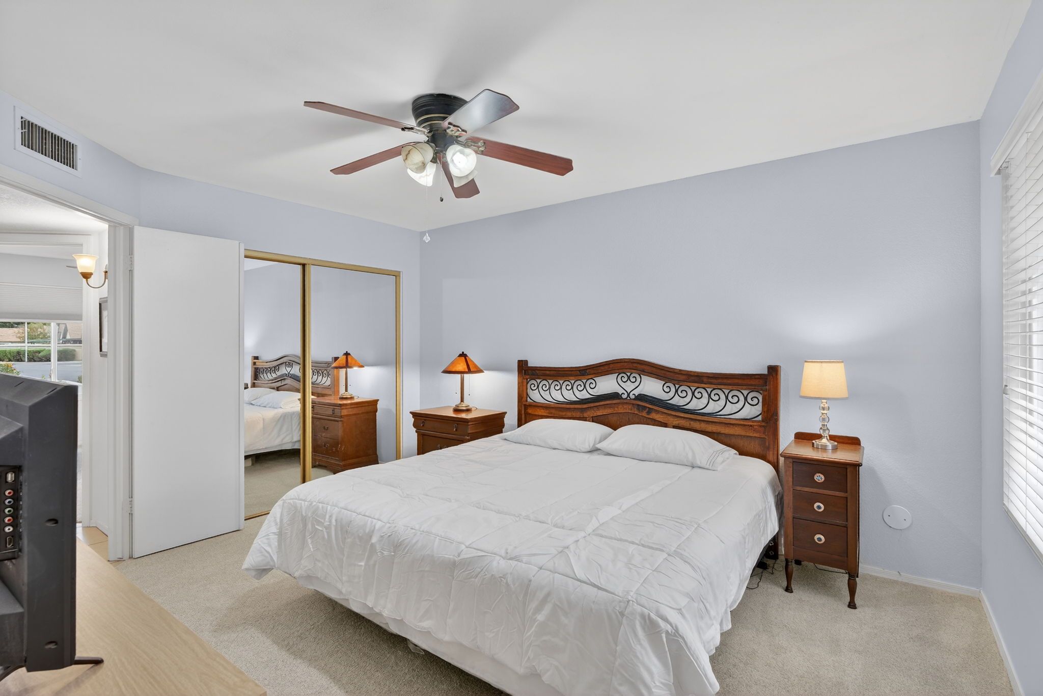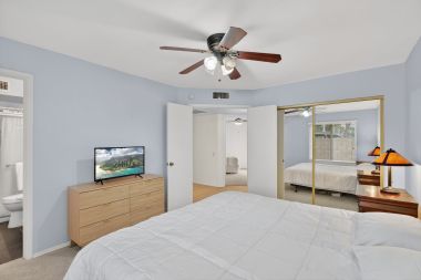 A sunlit primary suite with its own bath