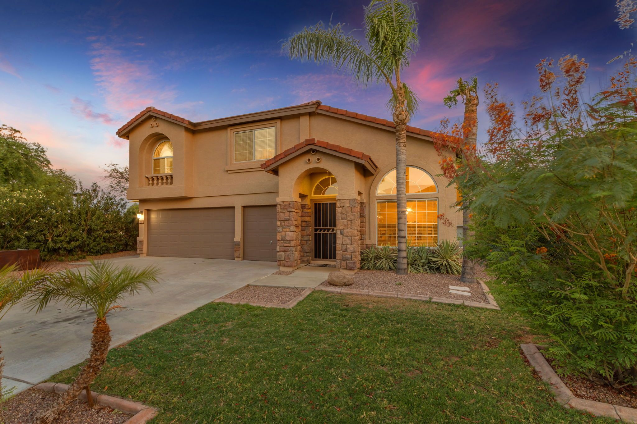 Positioned on a premium lot adjacent to the neighborhood park, this tropical backyard is lined with tall palms, stone walk ways, and a blue lagoon style pool with extended hardscaping for seating, entertaining, and enjoying al fresco dining as the temps start to drop. With gorgeous cotton candy skies and sunsets out of a magazine, this backyard will serve you for many years to come with room to run and play, serene seating, and just a quick pop over to the park for more outdoor fun right here in your Arizona home resort.