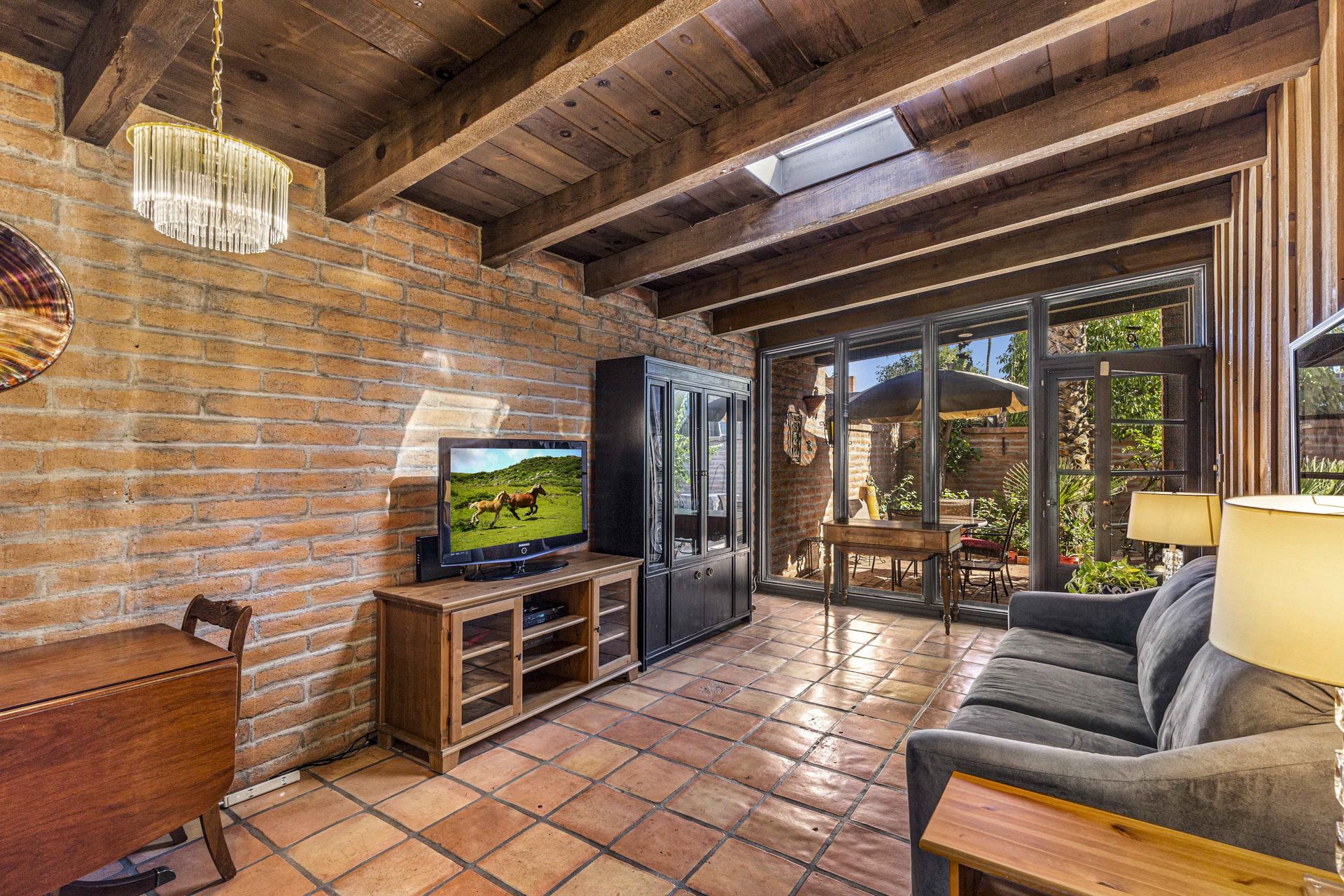 The perfect culinary space with newly updated countertops and hardware that compliments the design and style of the rest of the home, exposed brick and overhead wood beams. Whip up your favorite meals here while enjoying the views of the stylish living area and back patio.