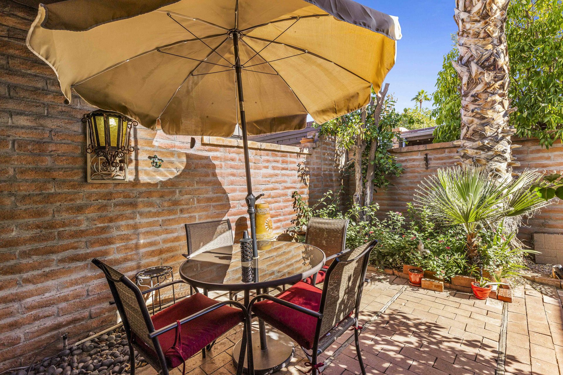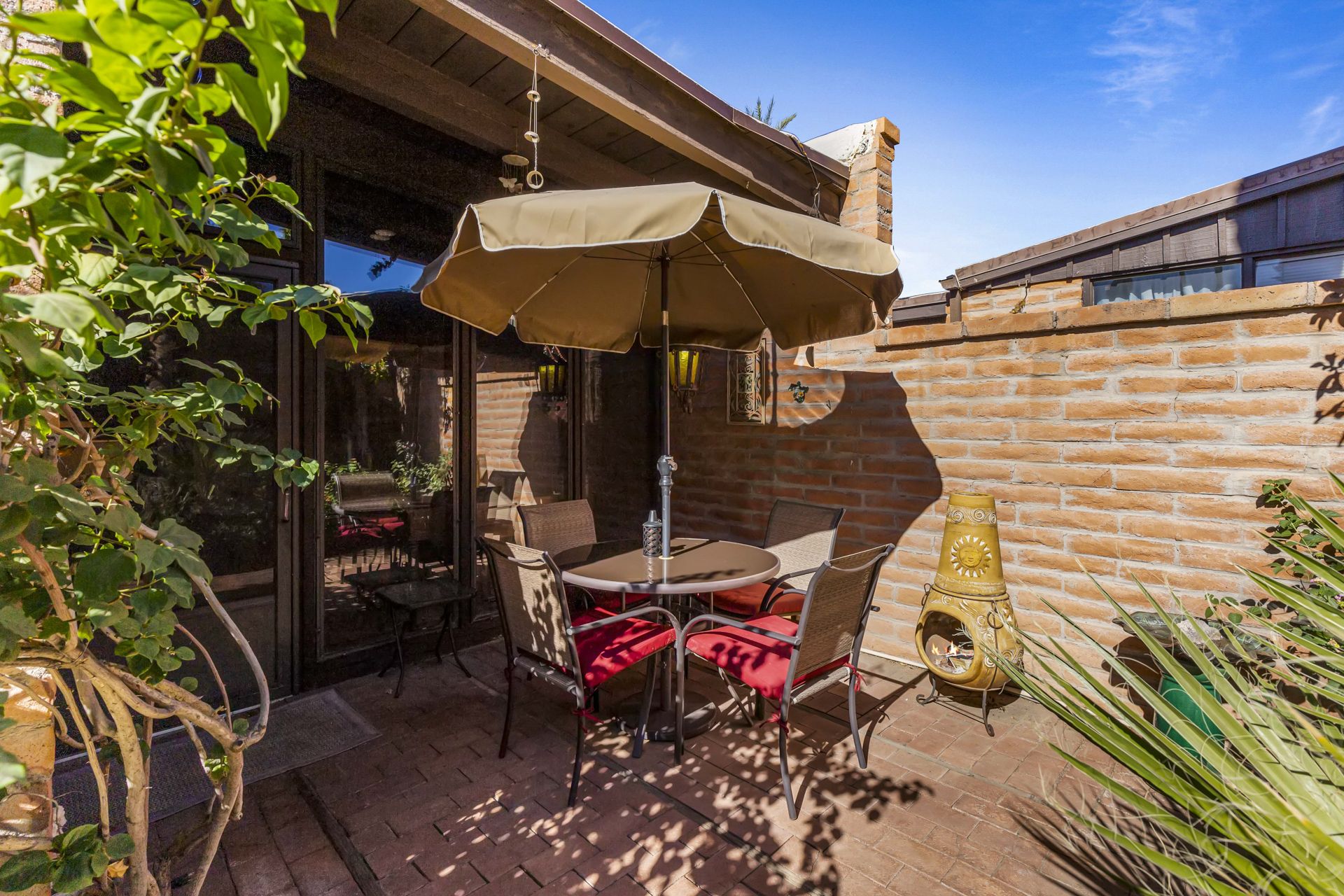 Head out into your beautiful covered patio and take a seat to enjoy the pavers, exposed brick and views of the stunning Arizona skies. Sit back, relax and listen to the birds in the nearby trees, watch the sunset or enjoy conversation with a good friend over drinks and appetizers. Love the shade trees, desert plants & a separate storage room for your convenience. The ultimate retreat!
