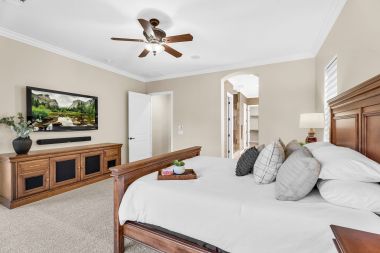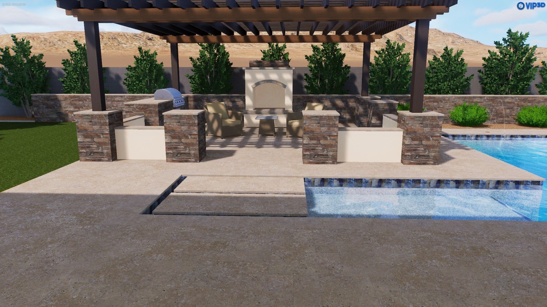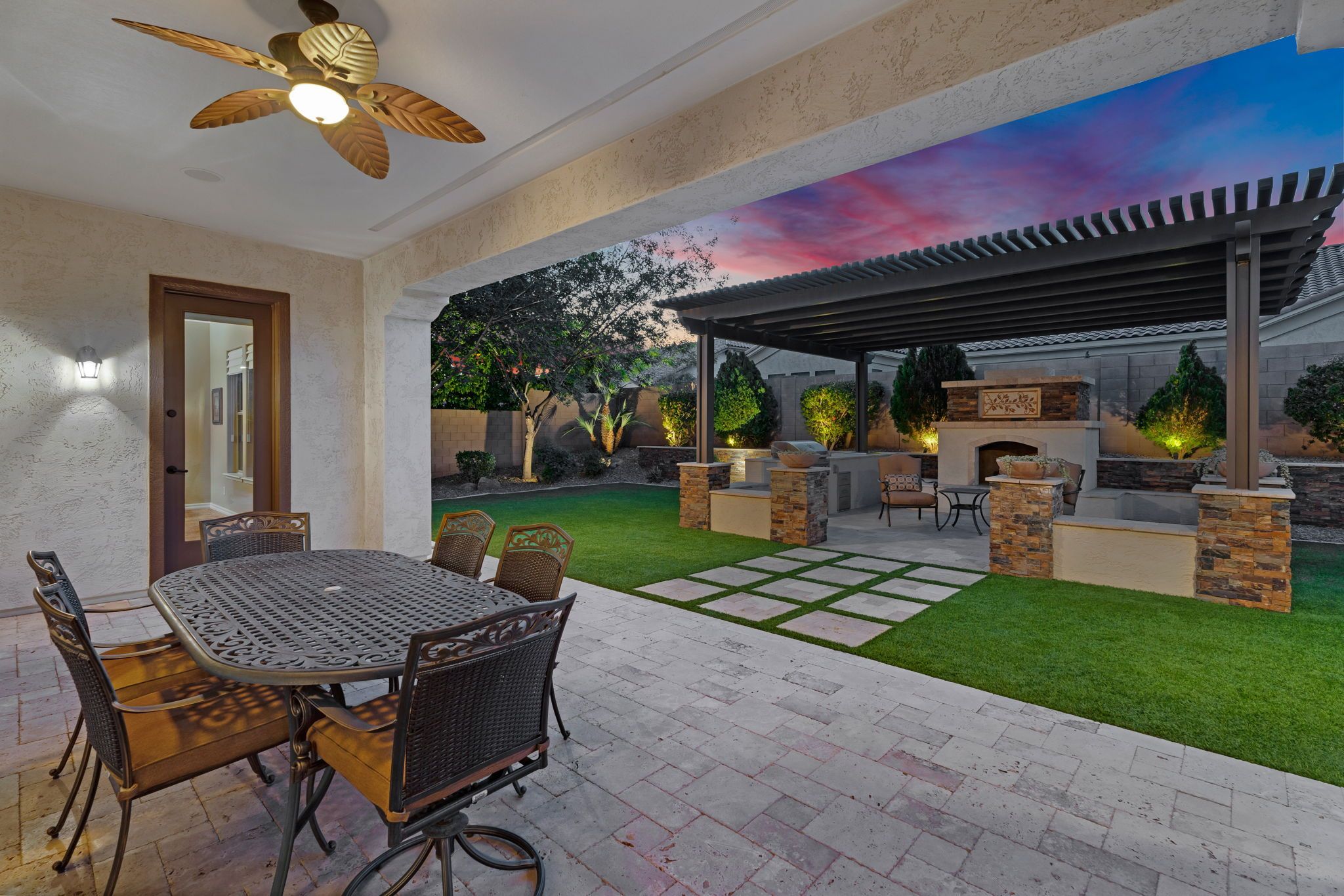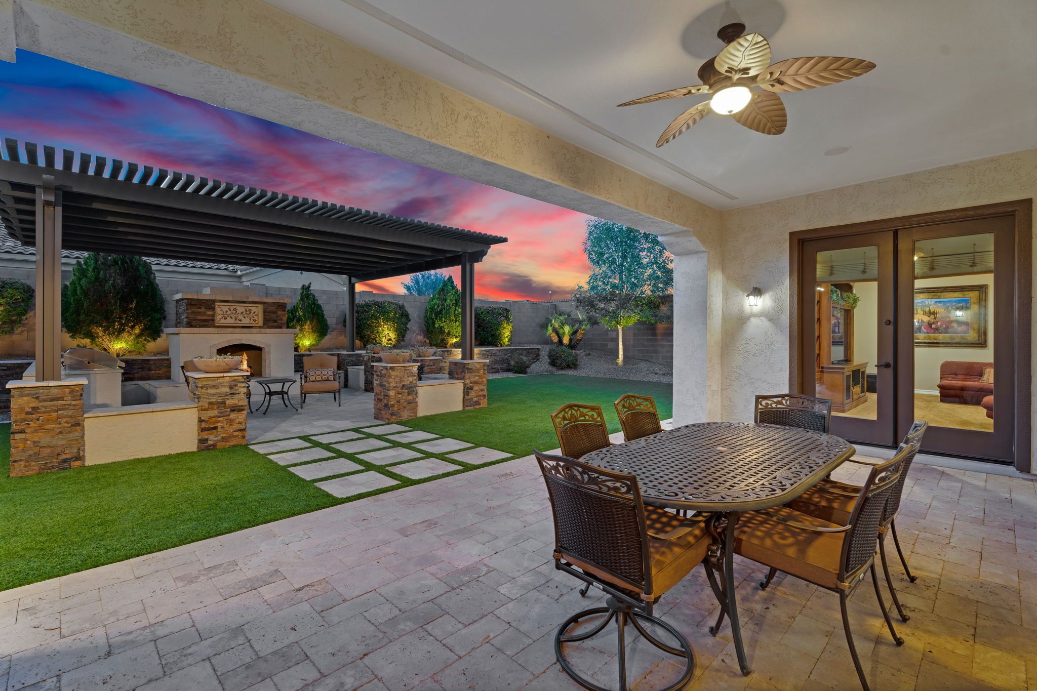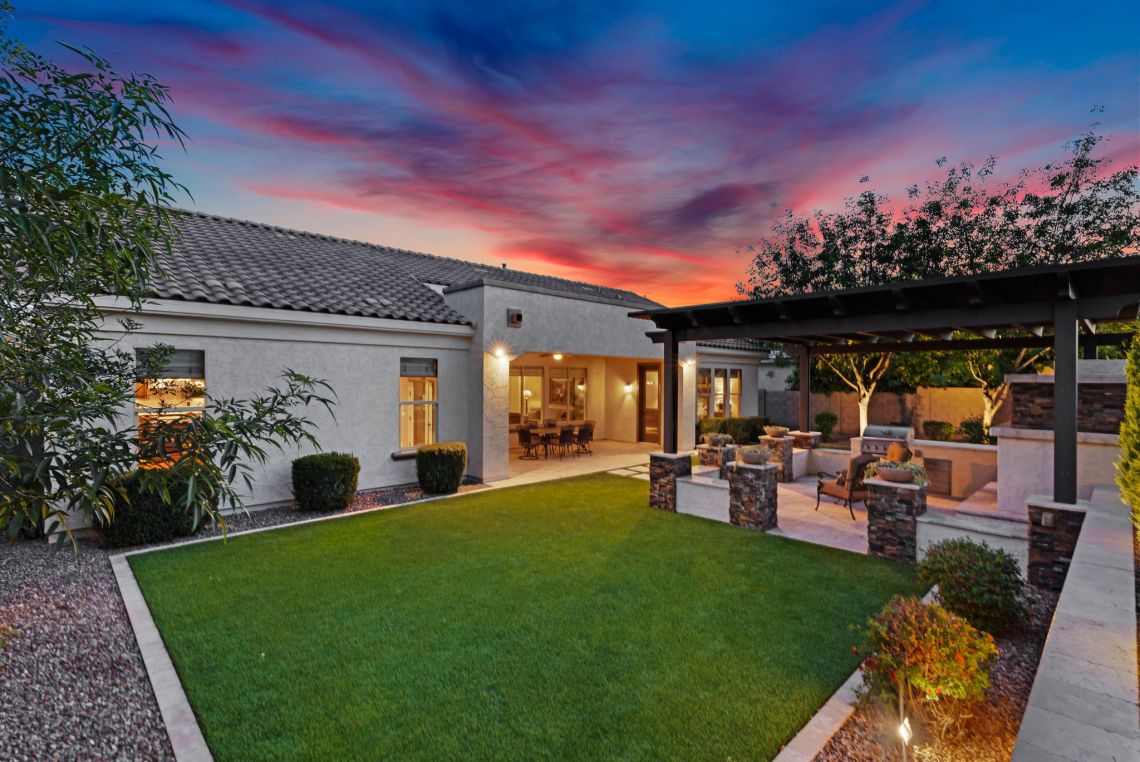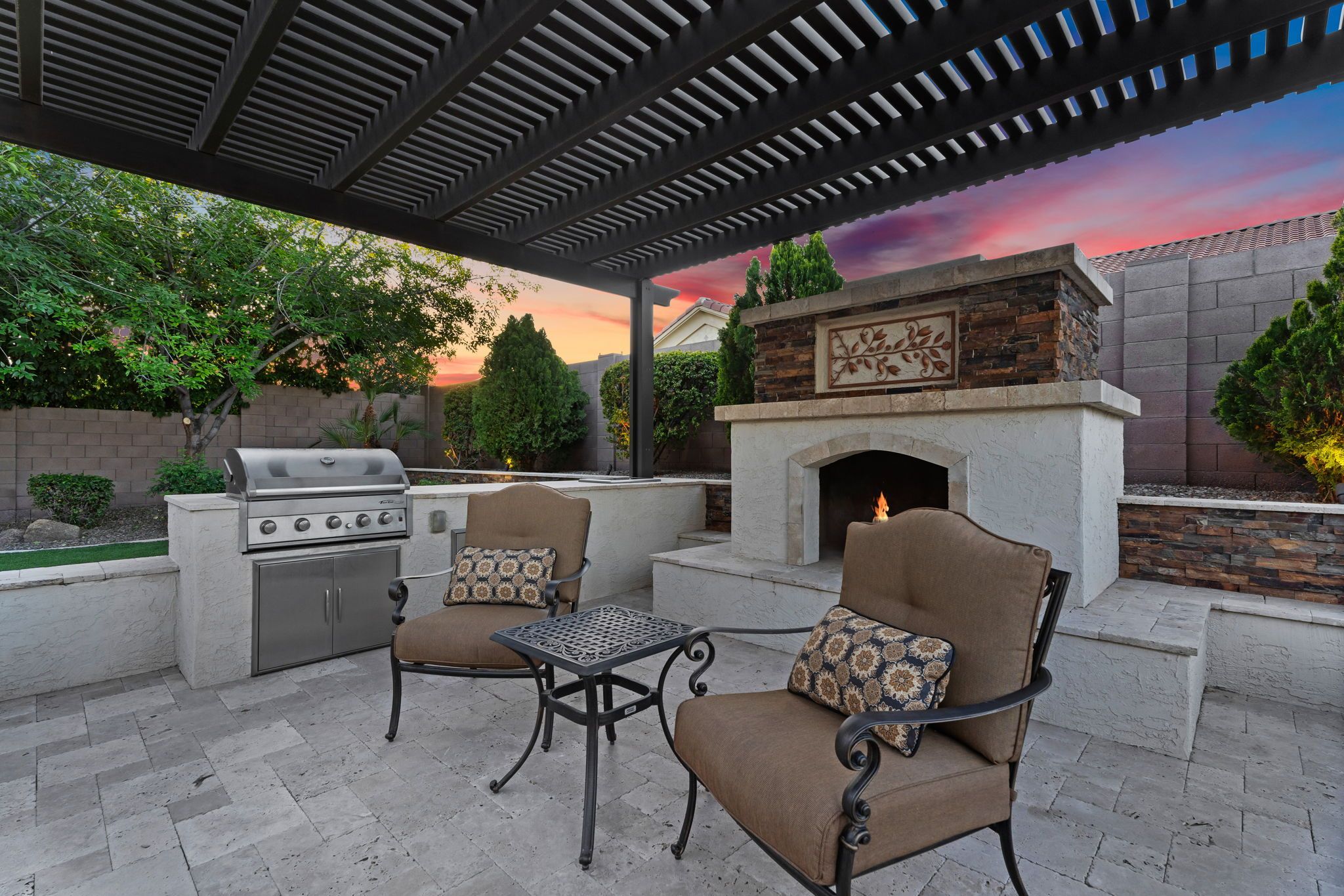 Step outside to a backyard designed for both relaxation and entertaining. The professionally designed landscape features lush artificial turf, a stunning 20x22 custom pergola with stacked stone accents, a charming wood-burning fireplace, and a built-in gas grill. Whether enjoying peaceful mornings with coffee or hosting lively gatherings under the stars, this outdoor space is nothing short of perfection. Looking for a pool? Carribean Pools has created the perfect backyard design! Across the street, scenic walking paths wind through the neighborhood, leading to tranquil waterfalls where ducks and swans glide effortlessly across the water—a signature touch of the Fulton Ranch lifestyle.