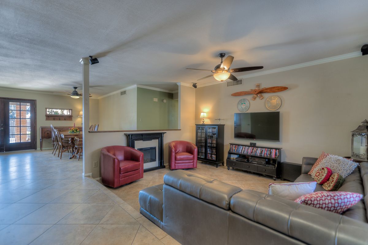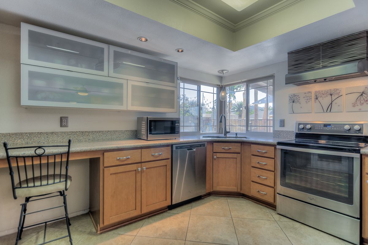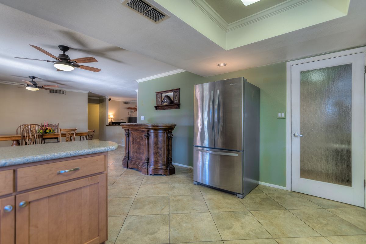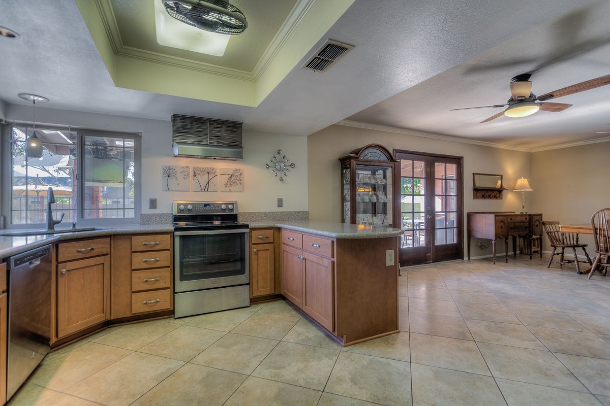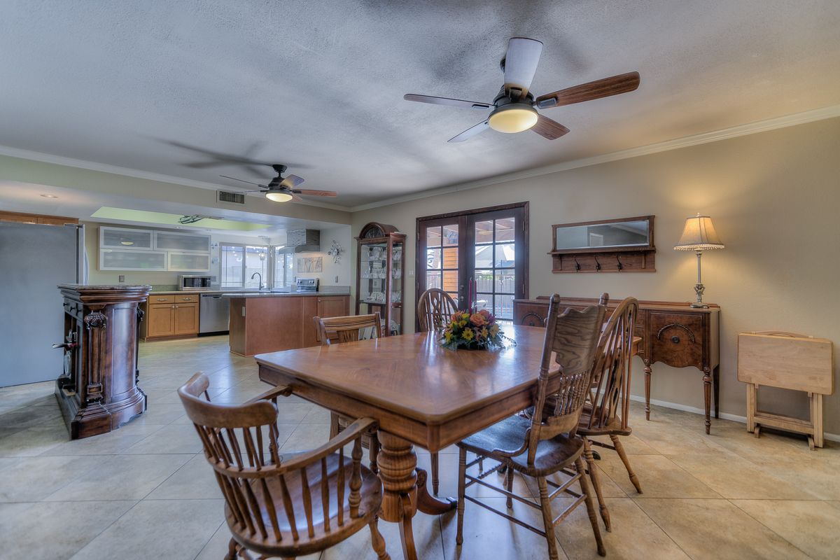 With a low maintenance front yard and on nearly a quarter acre lot, this home with traditional brick entryway features a sunken formal living room framed by a decorative half wall and a large dining or family room opening up into the eat-in kitchen with double doors and corner window with a view of the fenced pool, grassy lawn and several seating areas for welcoming friends and family. The kitchen includes quartz countertops and stainless steel appliances.