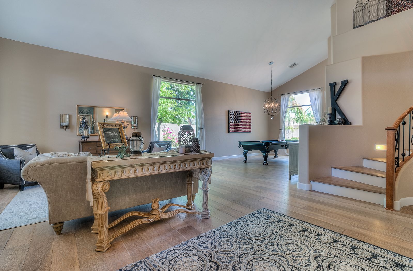 2. Upstairs Living Space – With the exception of the first-floor guest room with full guest bath, all of the bedrooms in this home are upstairs which makes for convenient cleanup when guests come over. Hidden away past the curved staircase and the cozy loft perfect for grabbing a snack after school or watching a late night movie, the three guest bedrooms and full guest bath sit opposite the oversized master with breathtaking view of the backyard. Walk into the lap of luxury with your master ensuite bath where you can relax in your soaking tub, take a quick shower, or pack up your gym bag in your walk-in closet before you head out to tennis at the Village at Ocotillo or a run through Veteran’s Oasis Park.