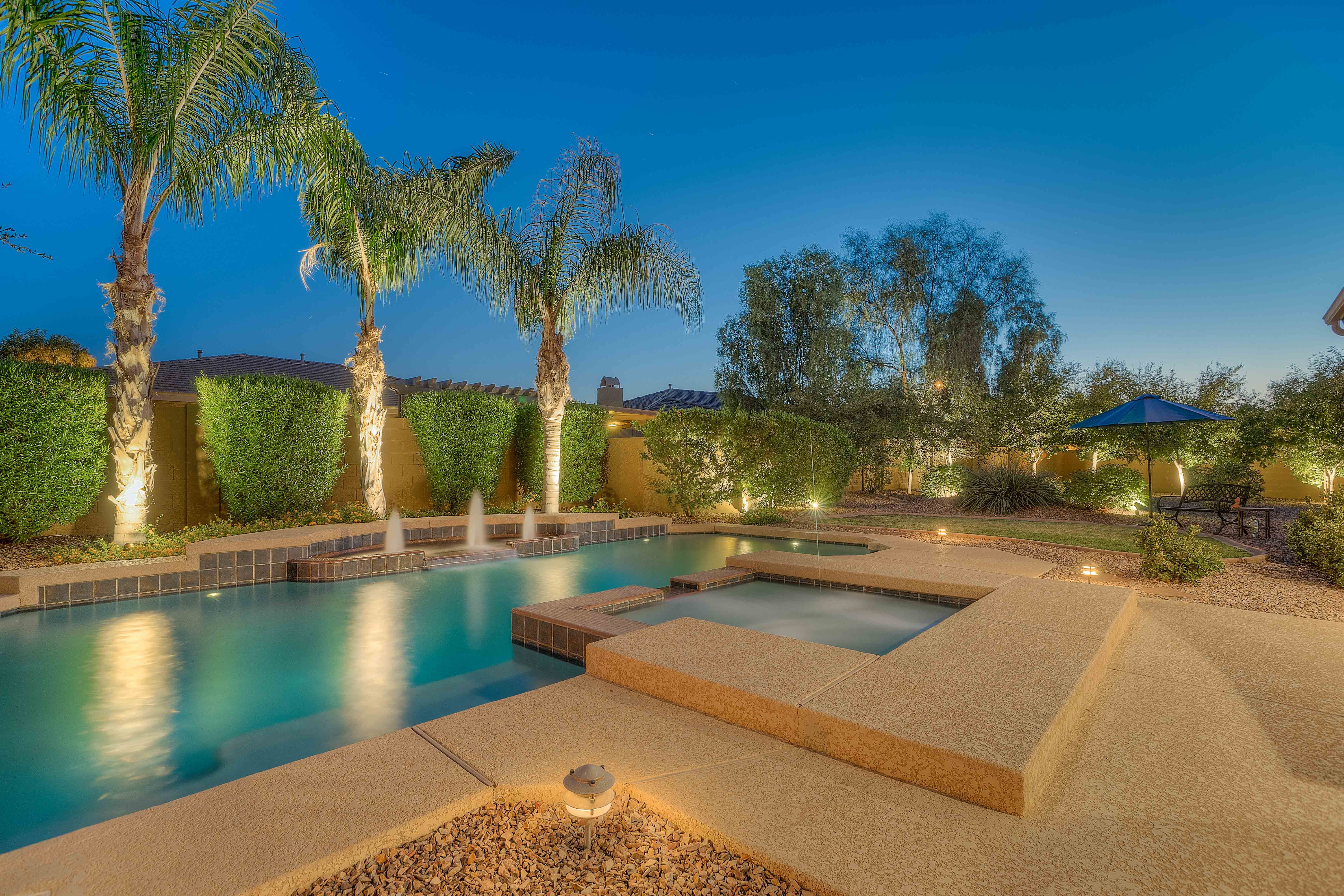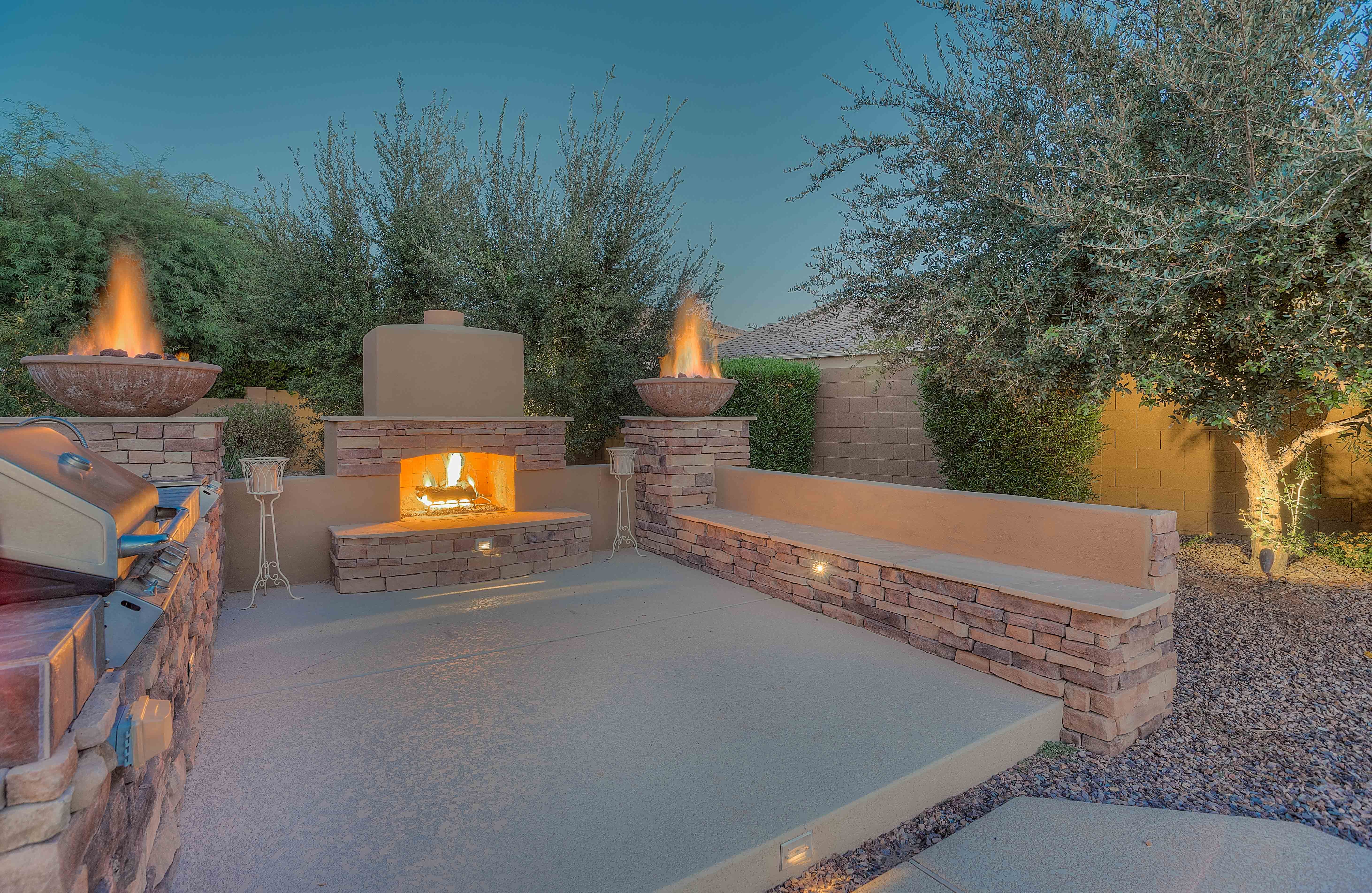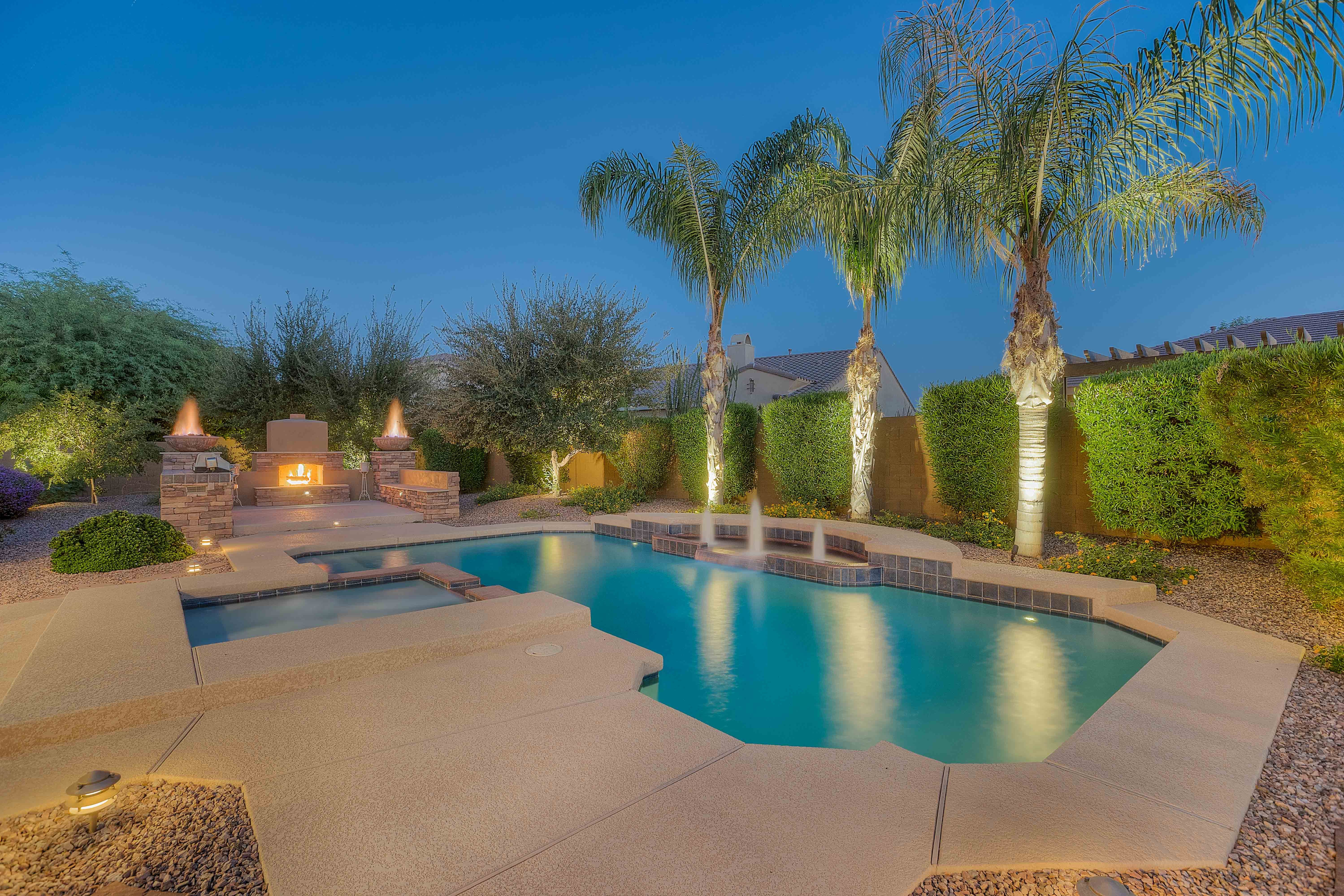 4. Have Your Pie & Eat It Too: One of the best cul-de-sac corners in this community, this pie-shaped lot has been fully landscaped with nearly $100,000 in upgrades between landscaping lighting around the heated salt water pool and spa with water feature & color wheel, citrus trees along the West side of the lot, and two grassy areas for celebrating life's special moments. With nearly 18,000sf of space including an elevated seating area around the built-in BBQ with outdoor fireplace, this backyard will be the home and the envy of all of your neighbors guaranteed.