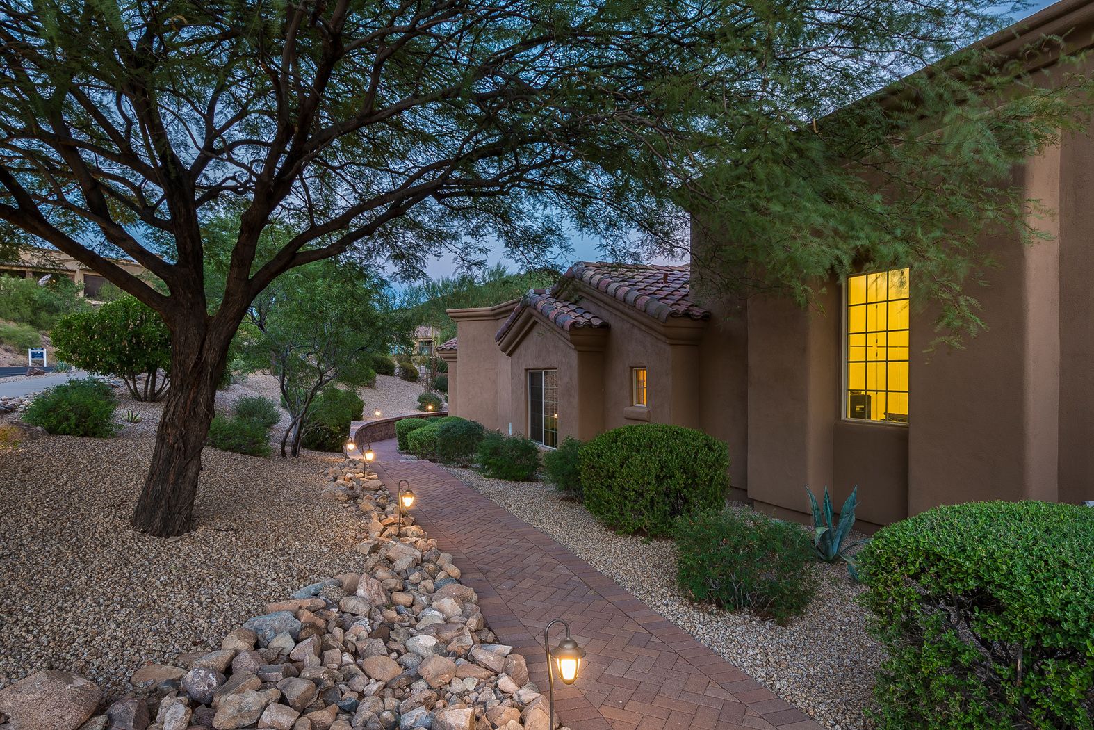 1. North Facing Beauty: Striking a balance between having exceptional curb appeal and complementing the natural desert scenery was at the forefront of the design of the outdoor landscaping. With strategically placed river rock, a paved path to the front entry & plants and trees that fit the property and the neighborhood's aesthetic, this home is welcoming from the very first look.