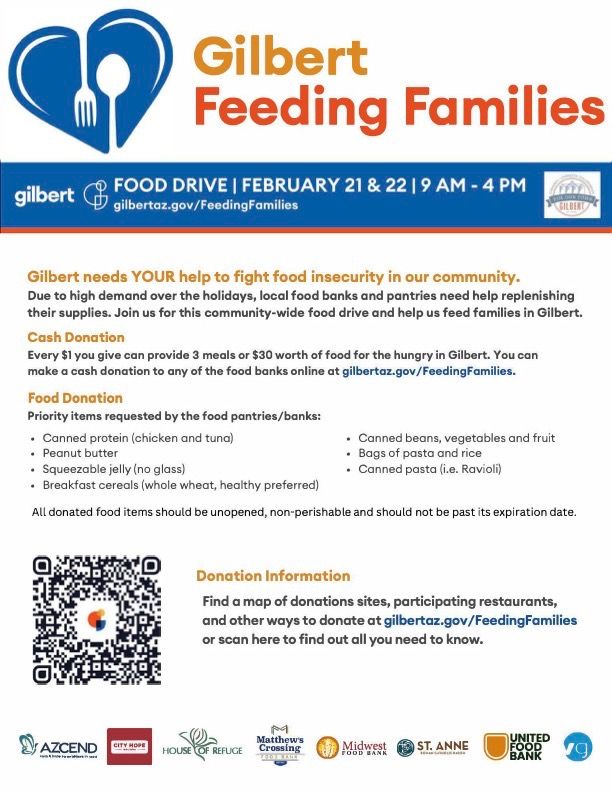 Before that, though, we’re deep into our Gilbert Feeding Families food drive. You can drop off canned goods at our office or pick up a box to run your own mini drive. This is one of those moments where small things - peanut butter, canned protein, pasta - truly add up.