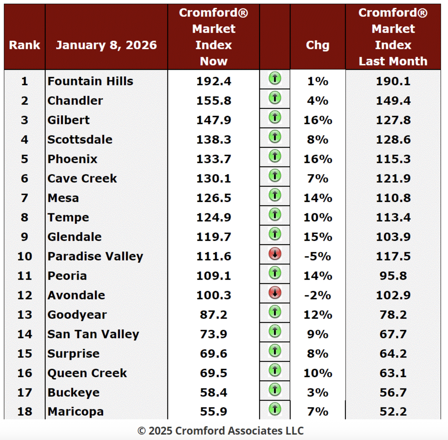 And the Cromford® Market Index - our favorite early signal - continues drifting toward sellers. Ten cities are now solidly in seller territory, two are balanced, and six still favor buyers. Gilbert, Phoenix, Mesa, Peoria, Queen Creek, and Goodyear are showing the strongest momentum, driven mostly by shrinking supply rather than a rush of demand.