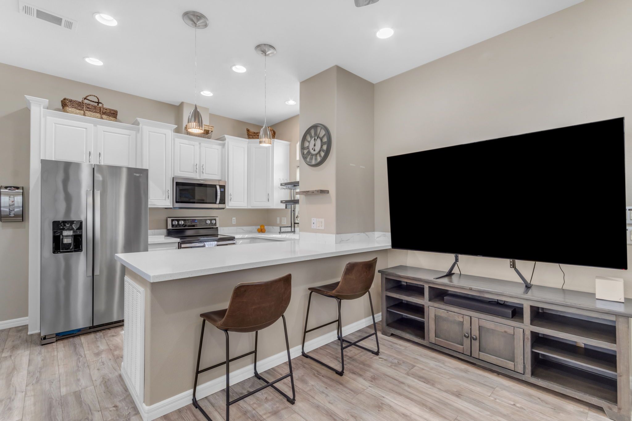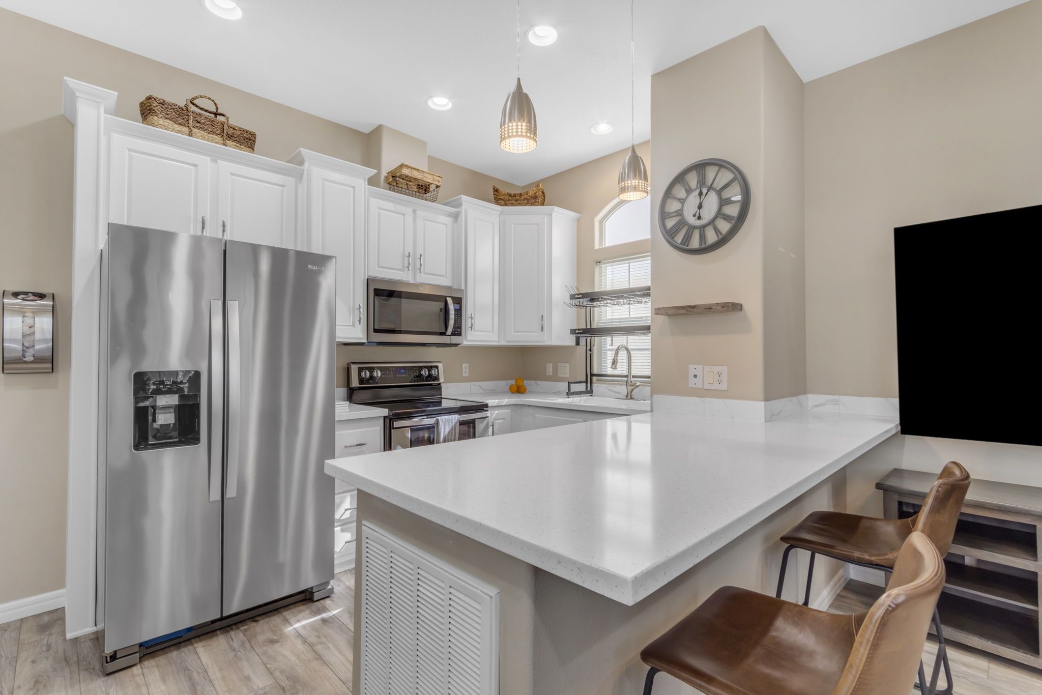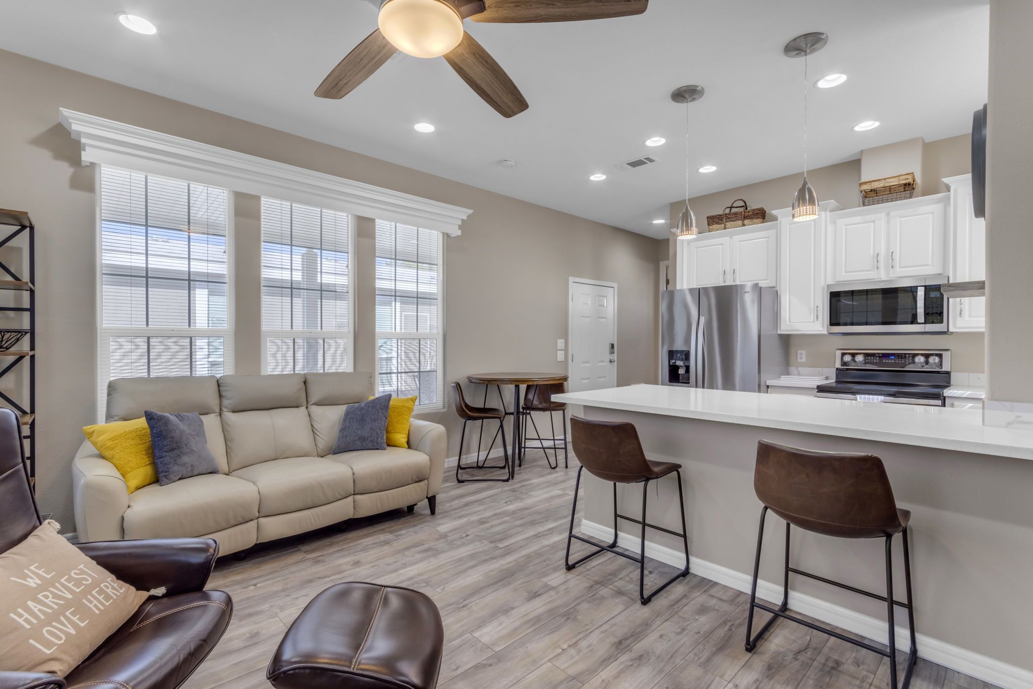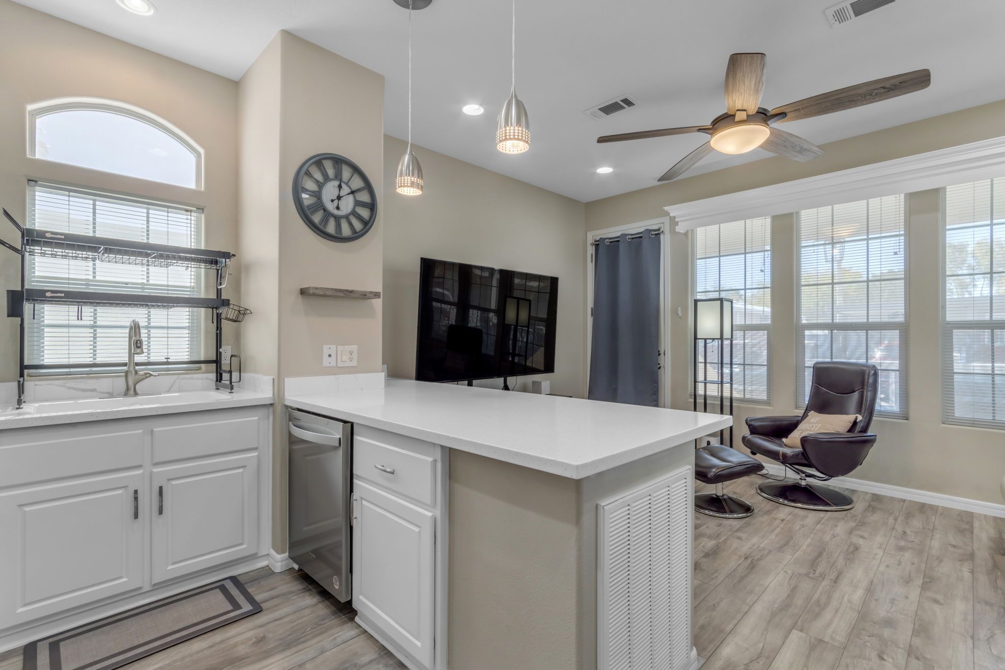 Move-in ready and fully furnished, this single level home shines from the exceptional curb appeal to the remodeled interior and everything in between. The modern color pallet extends from the upgraded windows and screens to the sleek flooring and countertop choices flowing seamlessly from the front door, into the popular greatroom floorplan and into the eat-in kitchen with granite counters, stainless steel appliances, and breakfast bear seating perfect for catching a quick bite before heading to the club house. Gone are the days of extra square footage and home owner maintenance, this is easy breezy living!