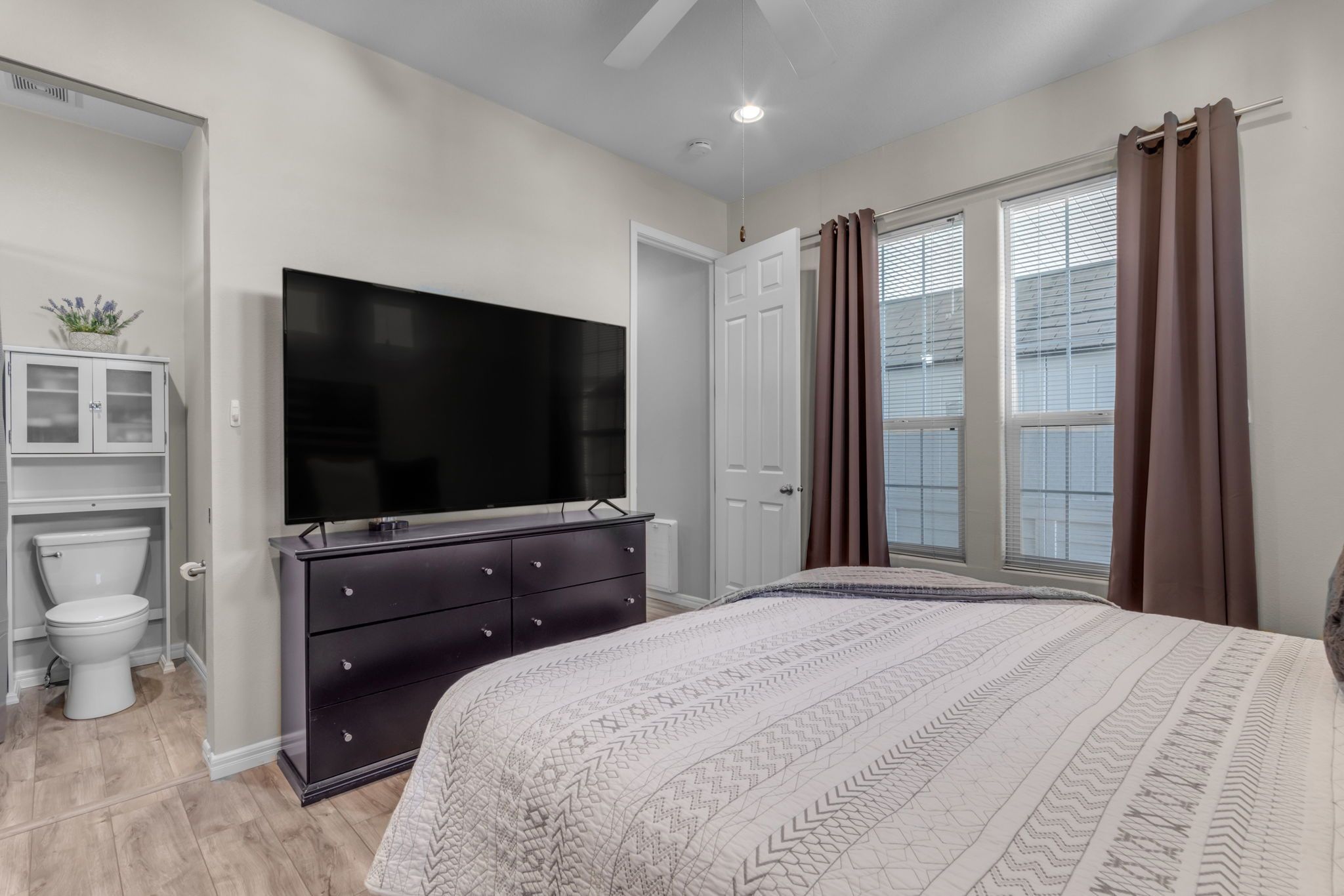 When looking for a home in the area, you have many floorplan options to choose from and this one puts the emphasis on YOU. This single level floorplan carries the beautiful upgrades into the bedroom with blonde wood laminate flooring, rich window coverings, and an ensuite bath with white on white cabinets and counter tops for a fresh feeling. Starting and ending your day in this cozy corner of your new home with bring you peace and the ideal reflection space for planning for this exciting stage of your life.