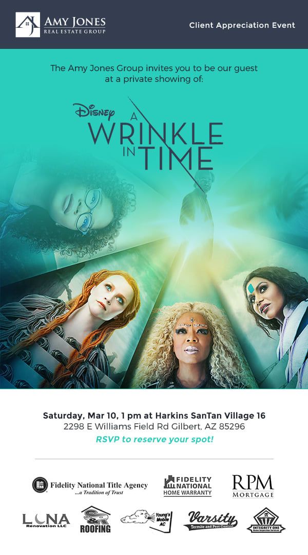But wait, there's more! Let's chat. In fact, we've got a theater reserved at the Harkins San Tan Village Saturday, March 10th for our friends, family, past clients and their friends and family looking to make a move this year and it would be the PERFECT time to get to know our team a little better and find out how we can help you with your move this year. PLUS, we've got giveaways and you get in on opening weekend to a private showing of A Wrinkle In Time! Check your calendars, and let us know if you can make it!